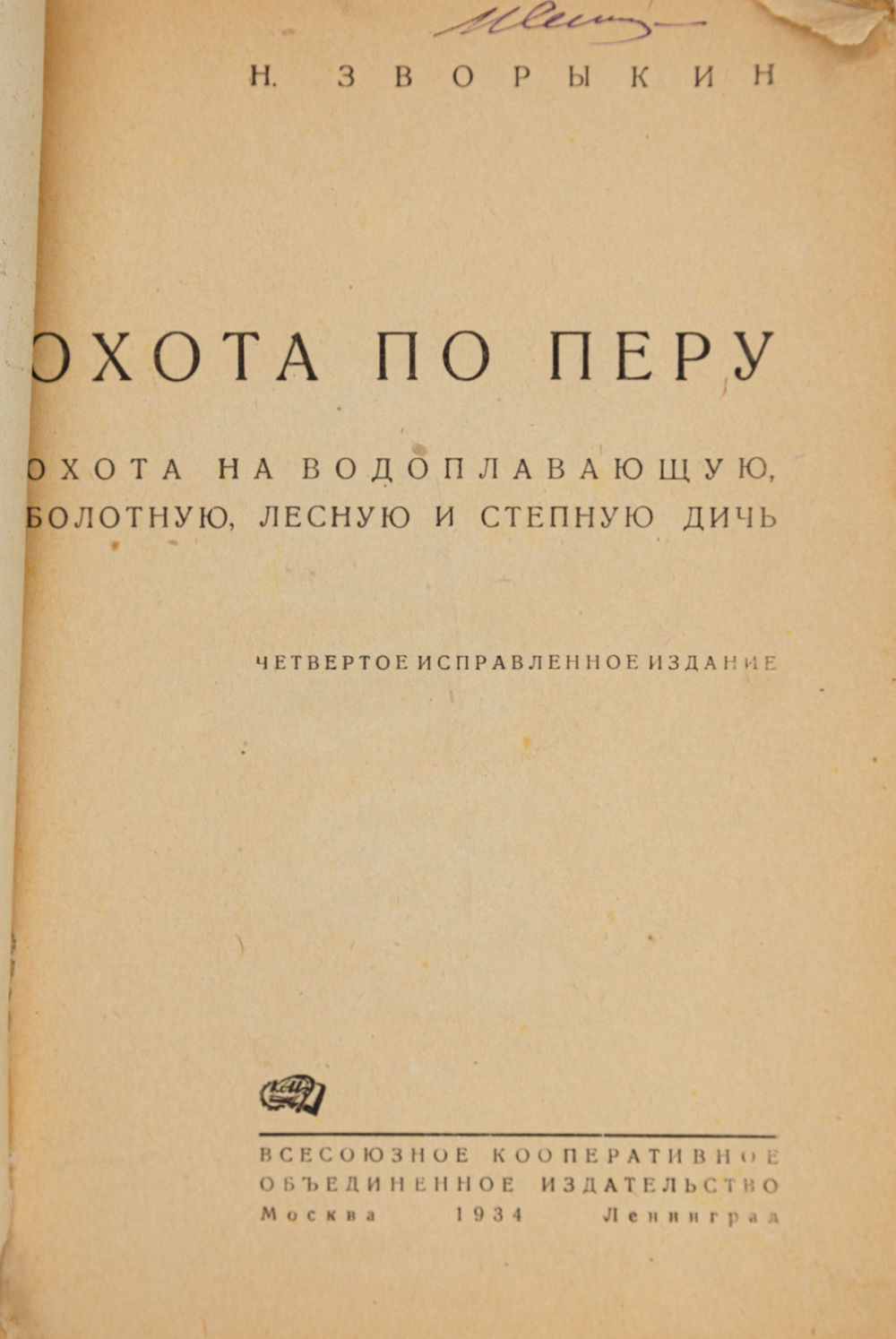 3) Зворыкин Н.А. Охота по перу: Охота на водоплавающую, болотную, лесную и степную дичь. – 4-е изд., испр. М.; Л.: Коиз, 1934. – 94, [2] с.; 22х15 см.