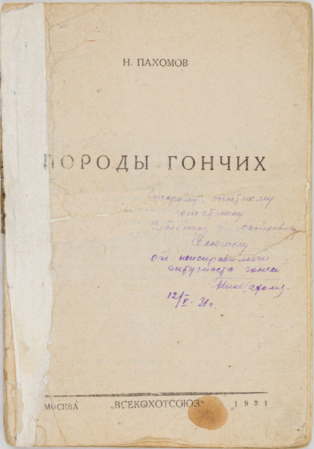 Дарственная надпись автора на тит. л.: «Старому, опытному гончарщику Владимиру Александровичу Селюгину от неисправимого энтузиаста гончих. Пахомов. 12/V 31 г.».