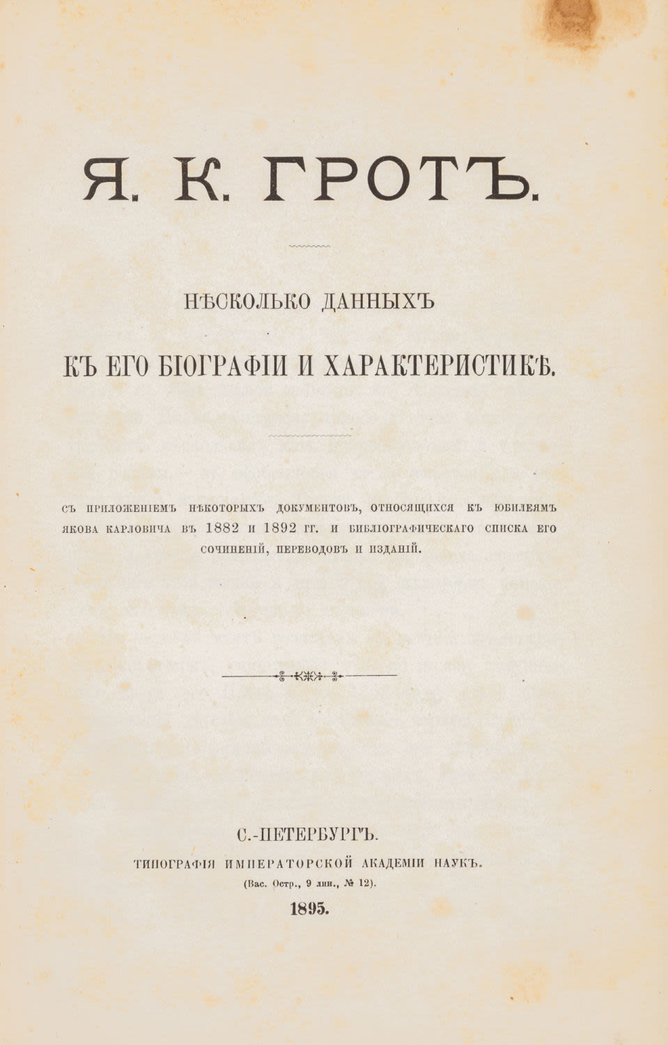 С приложением некоторых документов, относящихся к юбилеям Якова Карловича в 1882 и 1892 гг. и библиогр. списка его сочинений, переводов и изданий. СПб.: Тип. Акад. наук, 1895. – VIII, 239 с., [1] л. фронт. (портр.); 24,5×16 см.