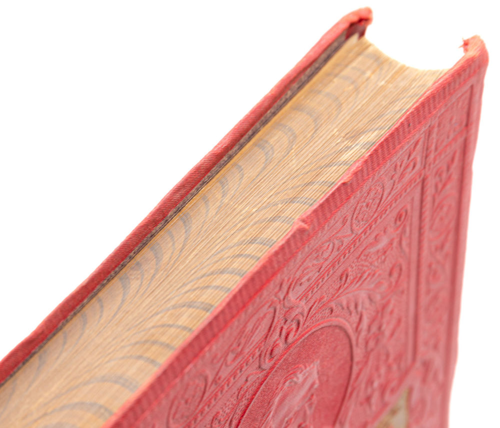 Переплет – издательский, художественный; картон, коленкор с золотым блинтовым и конгревным тиснением, трехсторонние мраморированные обрезы.