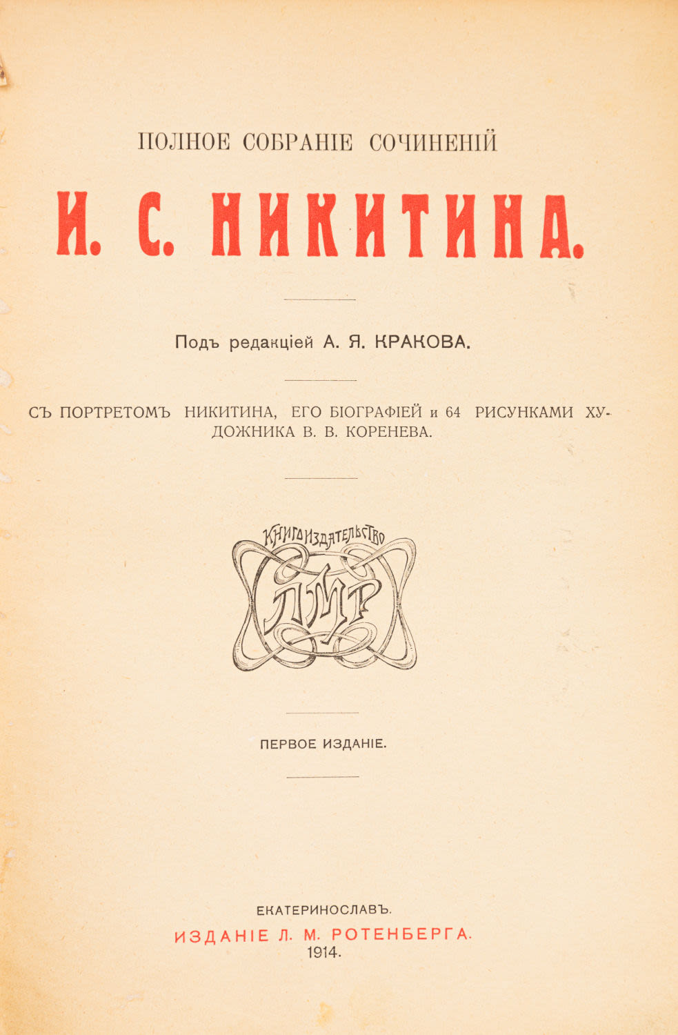 Под ред. А.Я. Кракова; с портр. Никитина, его биогр. и 64 рис. худож. В.В. Коренева. – 1-е изд. Екатеринослав: Изд. Л.М. Ротенберга, 1914. – XXXVI, 528, VII с.: ил., [1] л. фронт. (портр.), [20] л. ил; 27х19 см.