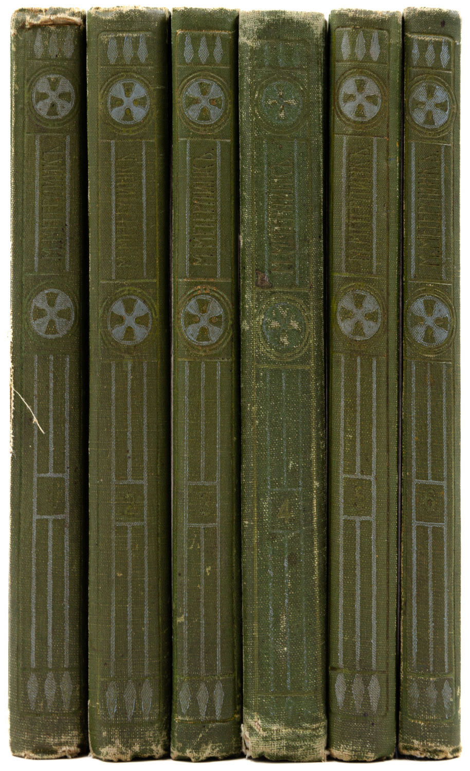Сохранность – хорошая, потертости и загрязнения переплетов, трещины в блоках, утрата свободного листа форзаца (Т. 1, 6), утрата свободного листа нахзаца (Т. 5), сов. шт. бук. маг. на обороте свободного листа нахзаца, загрязнения в блоках, верхний край С. 311 обрезан с ущербом для текста (Т. 1), номера ручкой на тит. л., утрата 1 л. ил. (Т. 6).