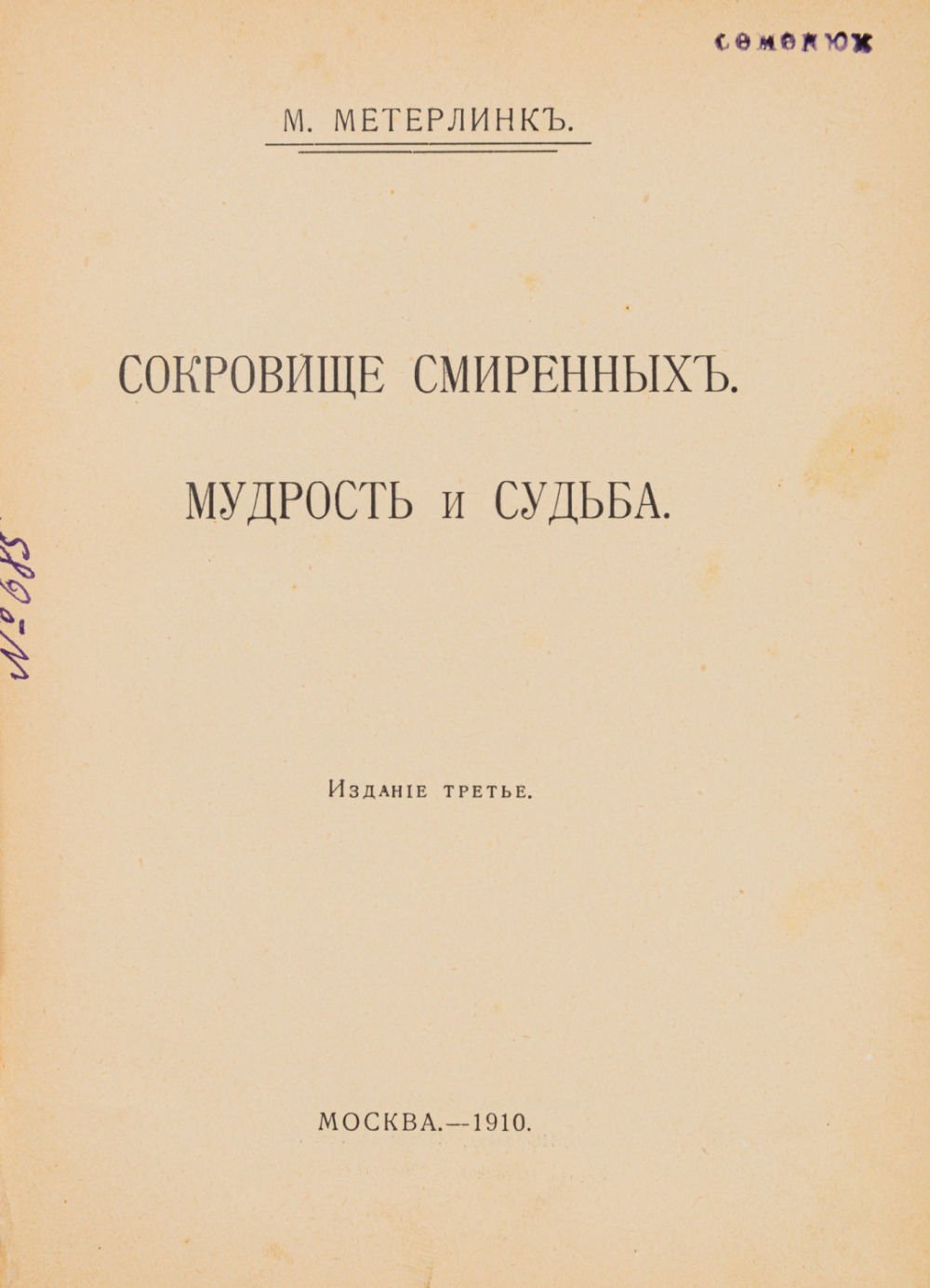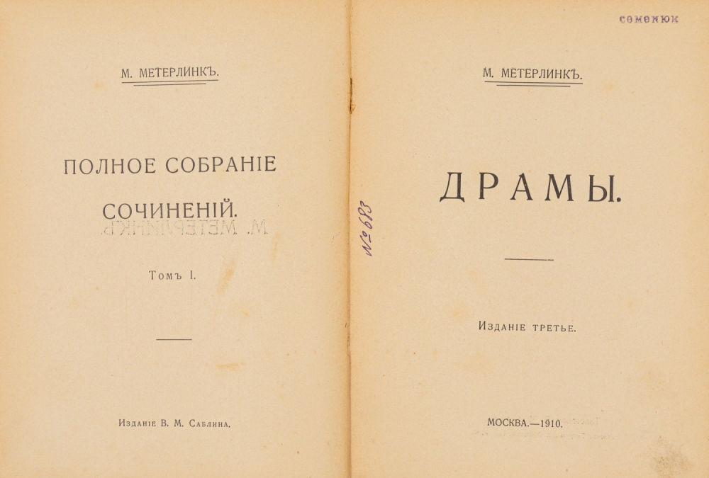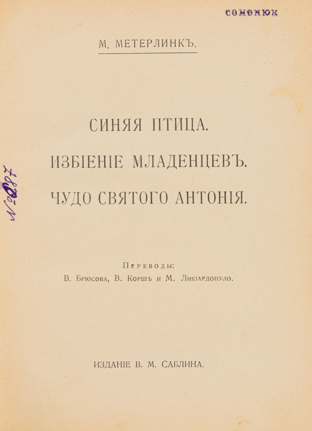 Т. 6: Морис Метерлинк: Очерк Ван-Бевера; Синяя птица. Избиение младенцев. Чудо святого Антония. – 2-е изд. – [6], L, 169 с., [1] л. портр.; 19×14 см.