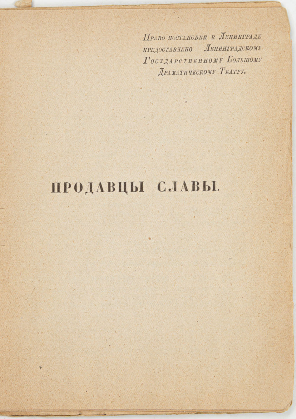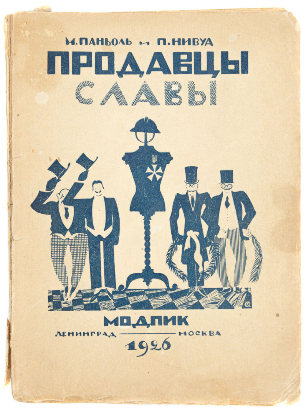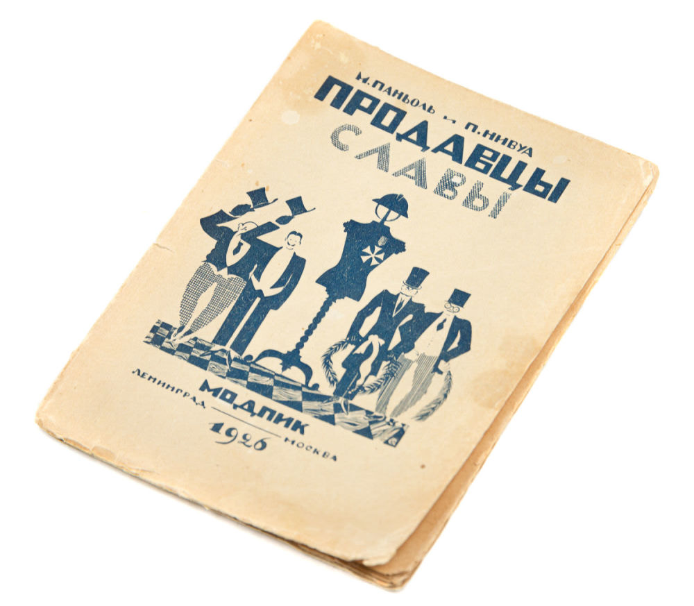 «Продавцы славы» — пьеса, написанная французскими режиссерами Марселем Паньоле (1895-1974) и Полем Нивуа (1894-1958) в 1924 г. для театра Мадлен в Париже. В СССР пьеса была поставлена театральным режиссером Николаем Акимовым (1901-1968) в Ленинградском Большом драматическом театре 11 декабря 1925 г. Обложка книги повторяет афишу этого спектакля.
