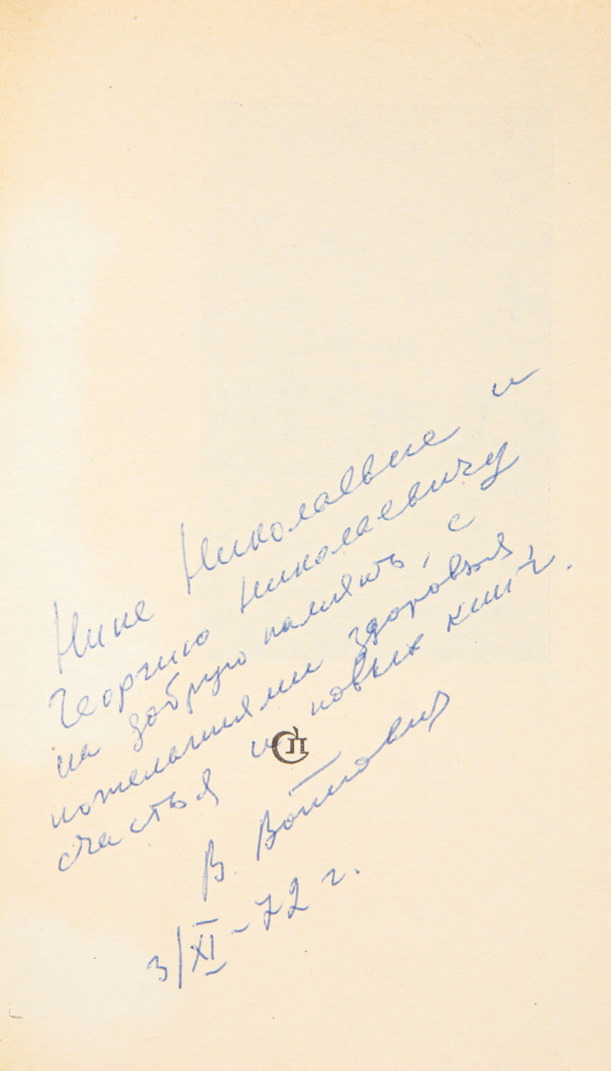 Дарственная надпись автора на авантитуле: «Нине Николаевне и Георгию Николаевичу на добрую память, с пожеланиями здоровья, счастья и новых книг. В. Войнович. 3/XI-72 г.».