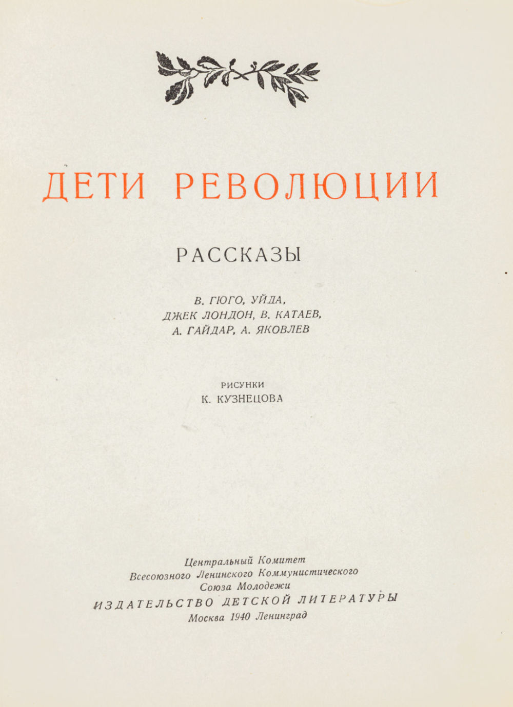 Рассказы В. Гюго, Уйда, Джек Лондон, В. Катаев [и др.]; Рис. К. Кузнецова. М.; Л.: Детиздат ЦК ВЛКСМ, 1940. — 232 с.: ил., [7] л. ил.; 23х18 см.