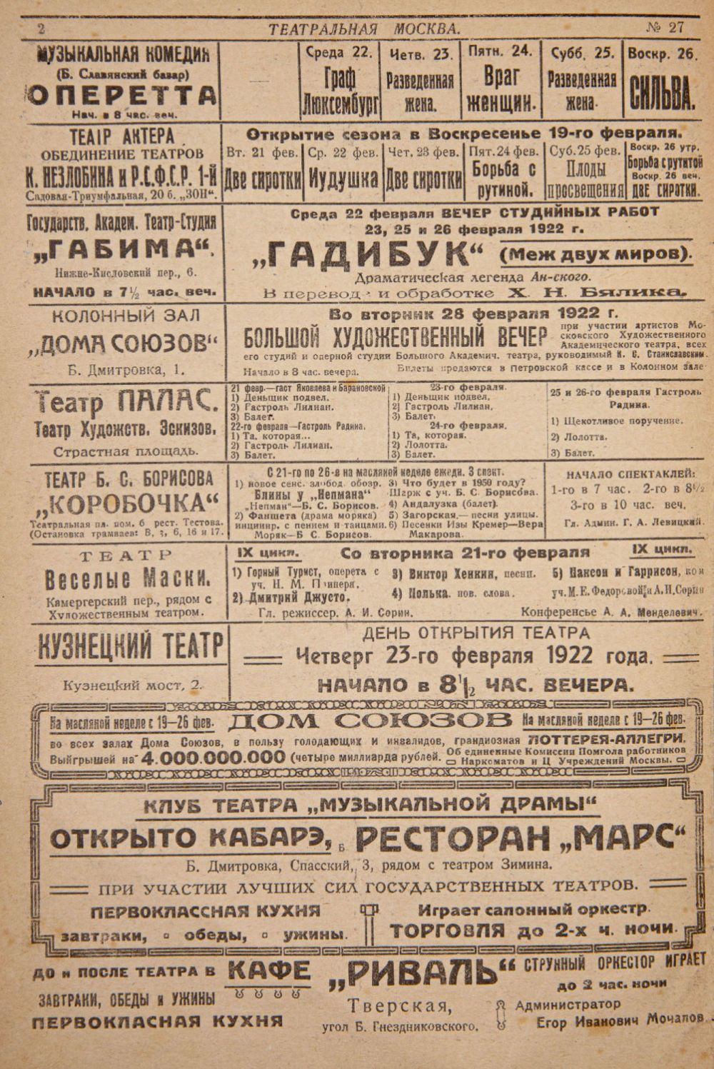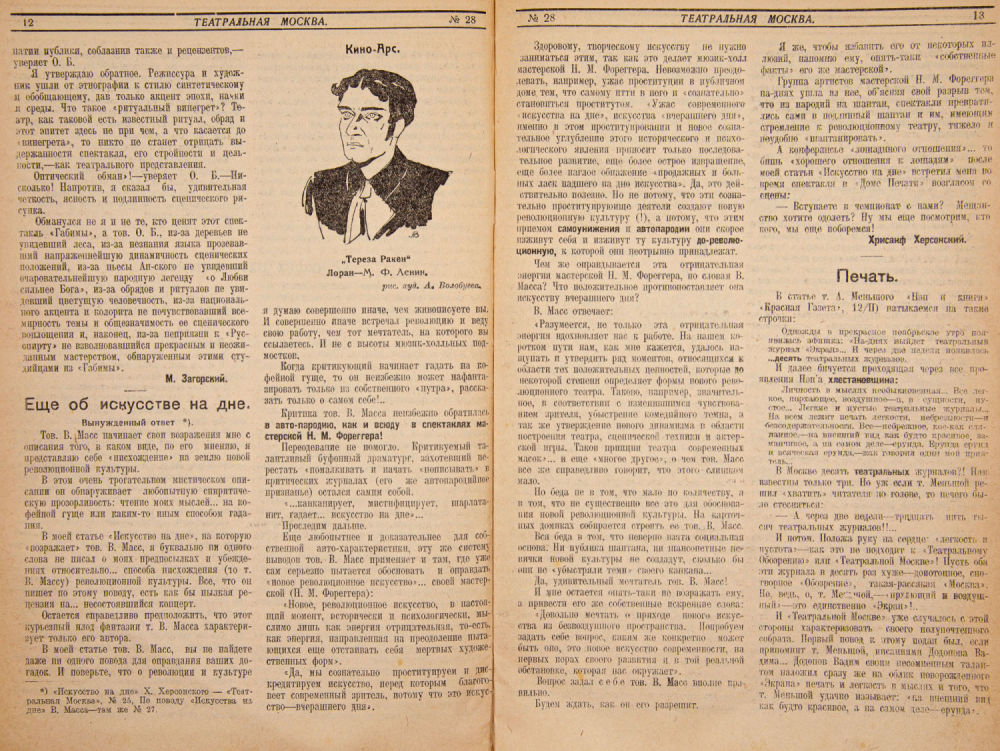 Орган текущего театрального дня; ред. Э. Бескина. М.: 29-я тип. М.С.Н.Х. при ВЧК, 1921-1922.
