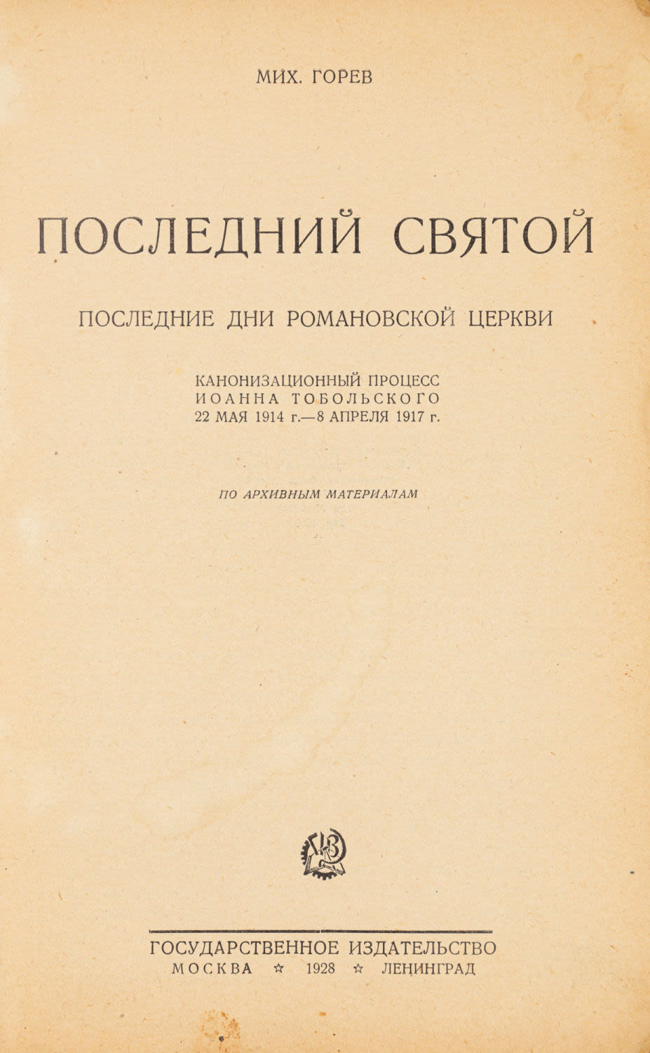 Канонизационный процесс Иоанна Тобольского 22 мая 1914 г. — 8 апреля 1917 г. М.; Л.: Государственное изд-во, 1928. — 280 с.: факс.; 23х15 см.