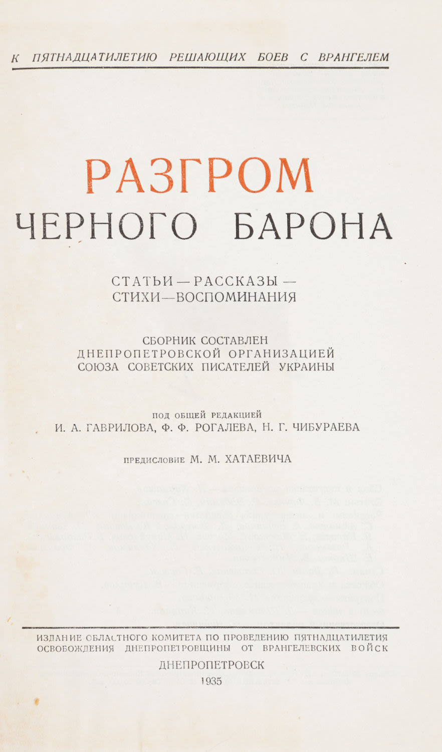 Ред. И.А. Гаврилова, Ф.Ф. Рогалева, Н.Г. Чибураева; предисл. М.М. Хатаевича. Днепропетровск: Изд. областного ком. по проведению пятнадцатилетия освобождения Днепропетровщины от врангелевских войск, 1935. — 272 с.: ил.; 23х15 см.