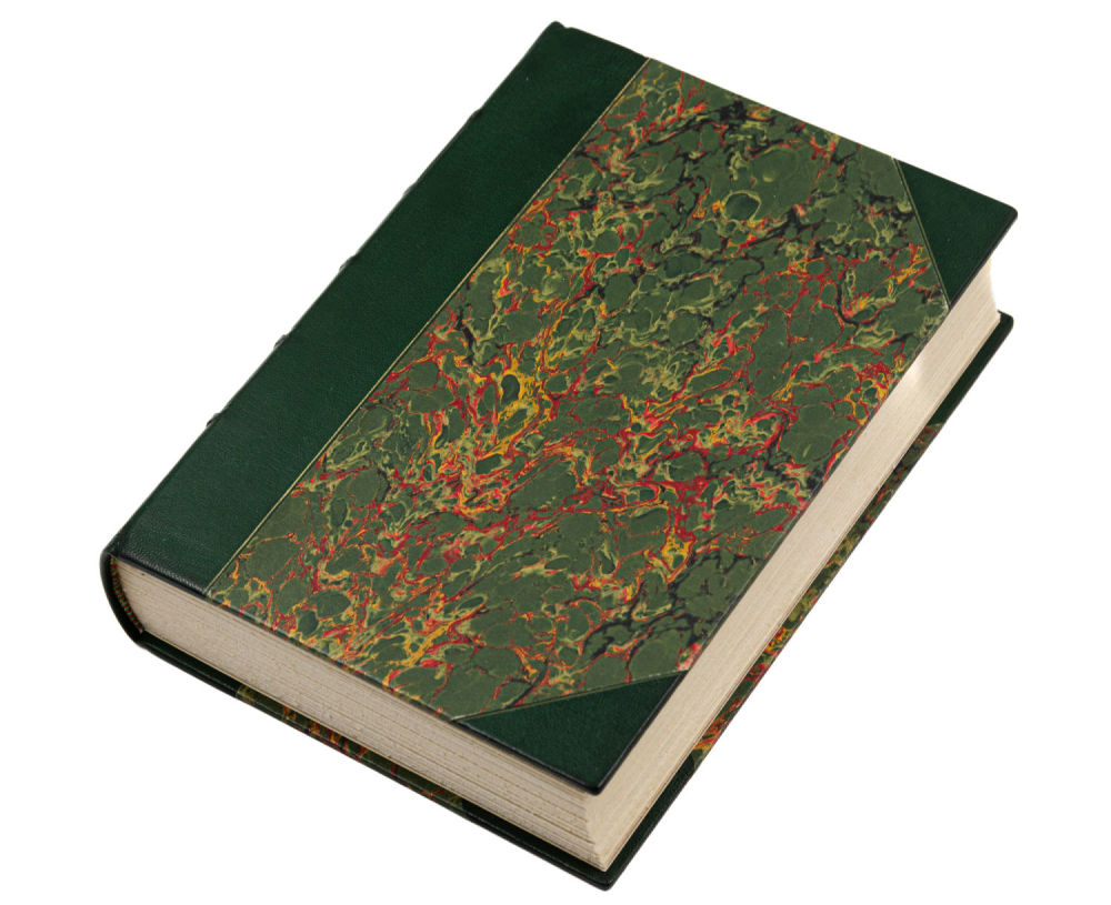 Переплет – владельческий; картон, мраморная бумага, корешок – кожа, разделен бинтами на шесть сегментов.