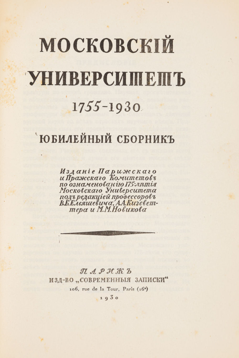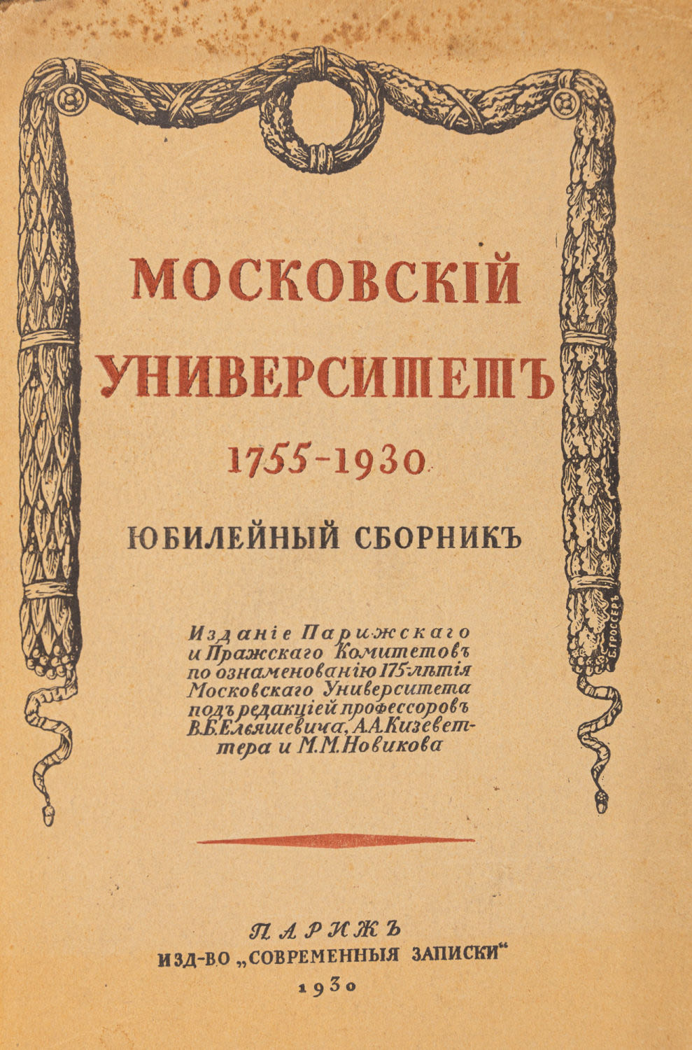 Изд. Парижского и Пражского Комитетов по ознаменованию 175-летия Московского университета под ред. проф. В.Б. Ельяшевича и др. Париж: Современные записки, 1930. – 467 с. 23,5×16 см.