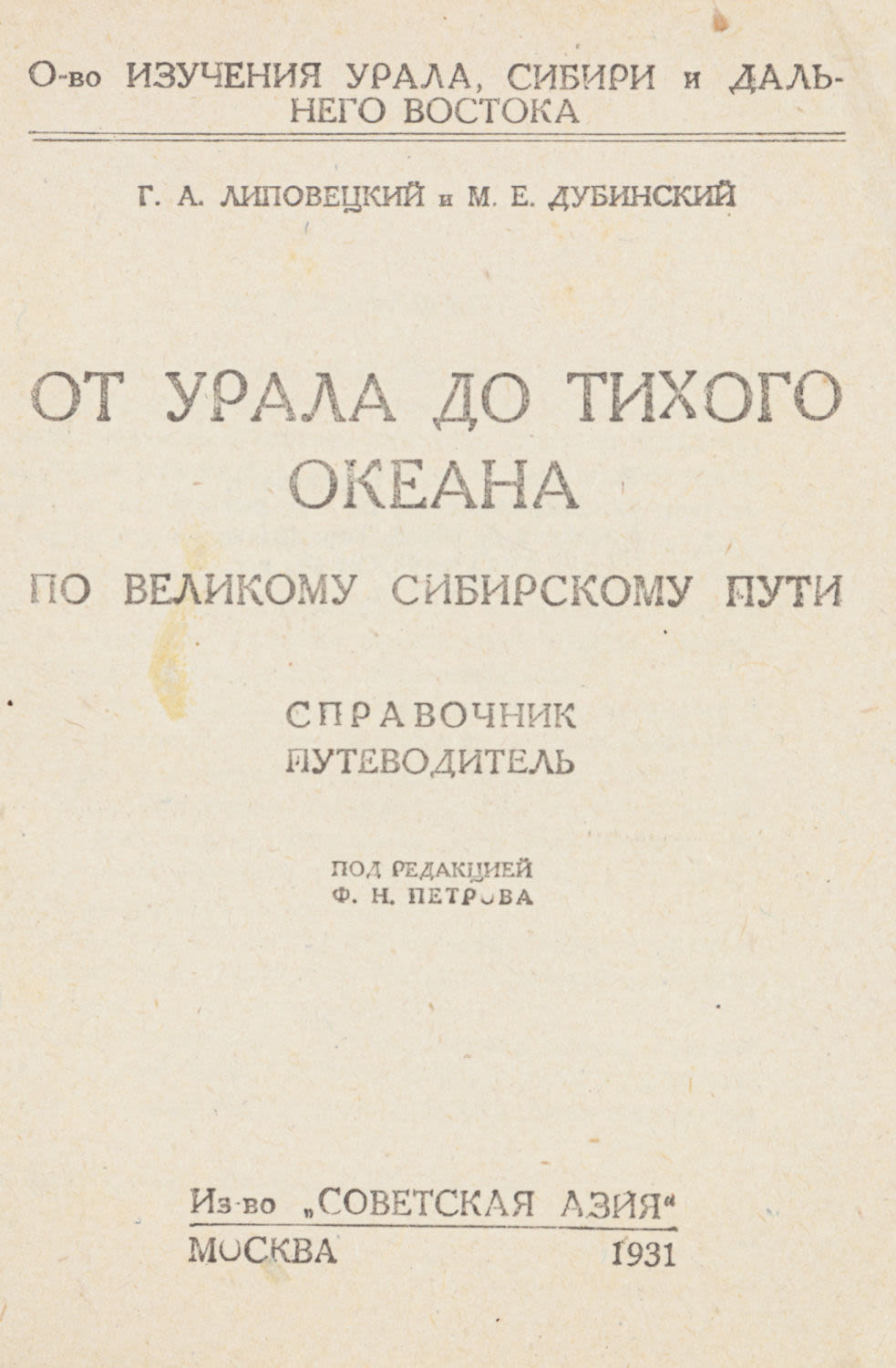 По великому Сибирскому пути: Справочник путеводитель; под ред. Ф.Н. Петрова. М.: Советская Азия, 1931. – 151, [1] с.: ил.; 15х12 см.