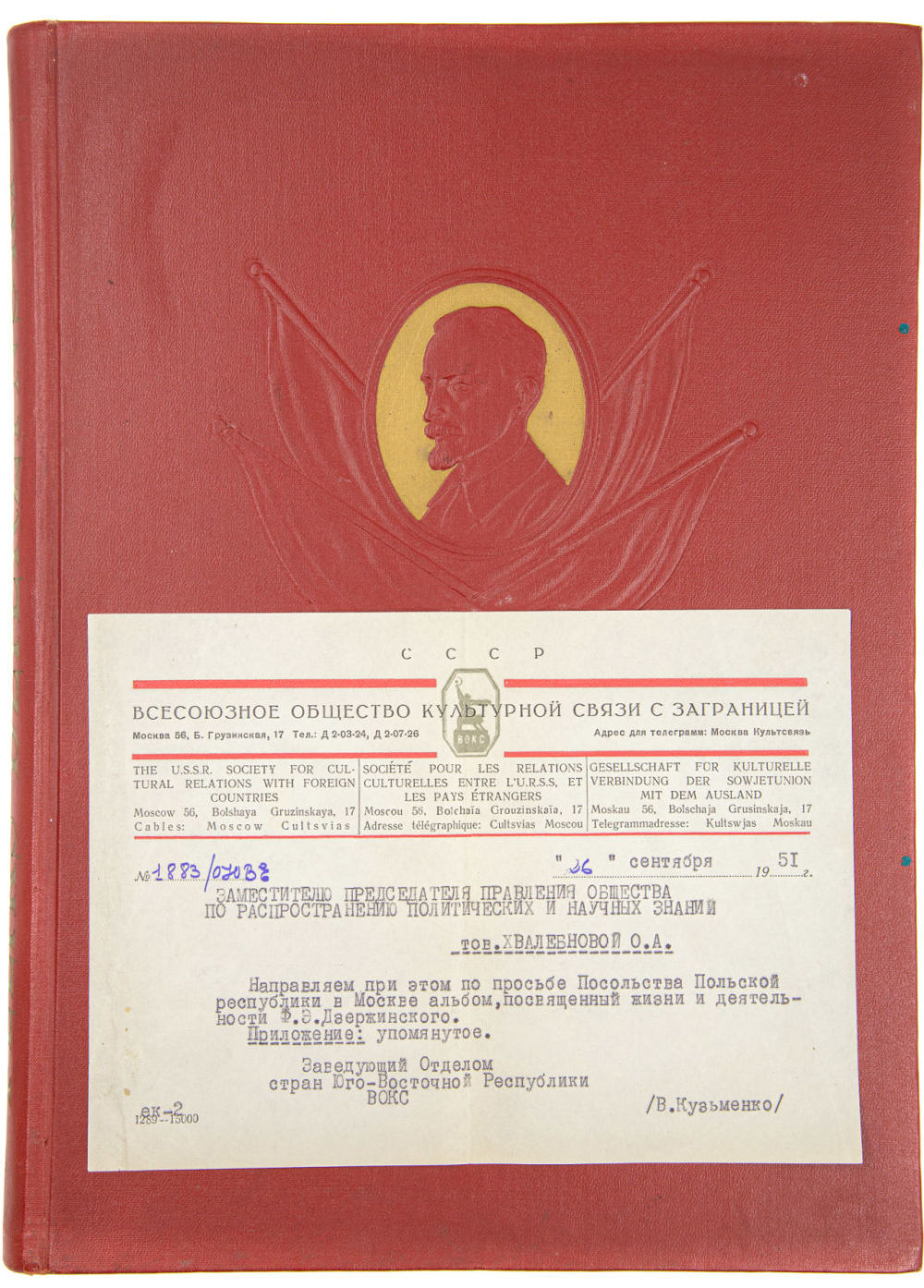 С письмом Отдела стран Юго-Восточной Республики Всесоюзного общества культурной связи с заграницей, адресованным заместителю председателя правления Общества по распространению политических и научных знаний в Польше Хвалебновой О.А. (1902-1982). – 2 с.; 20×14 см.