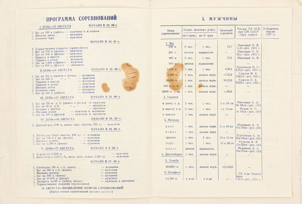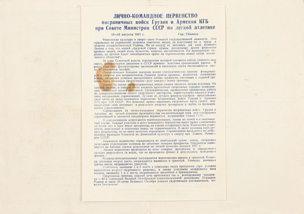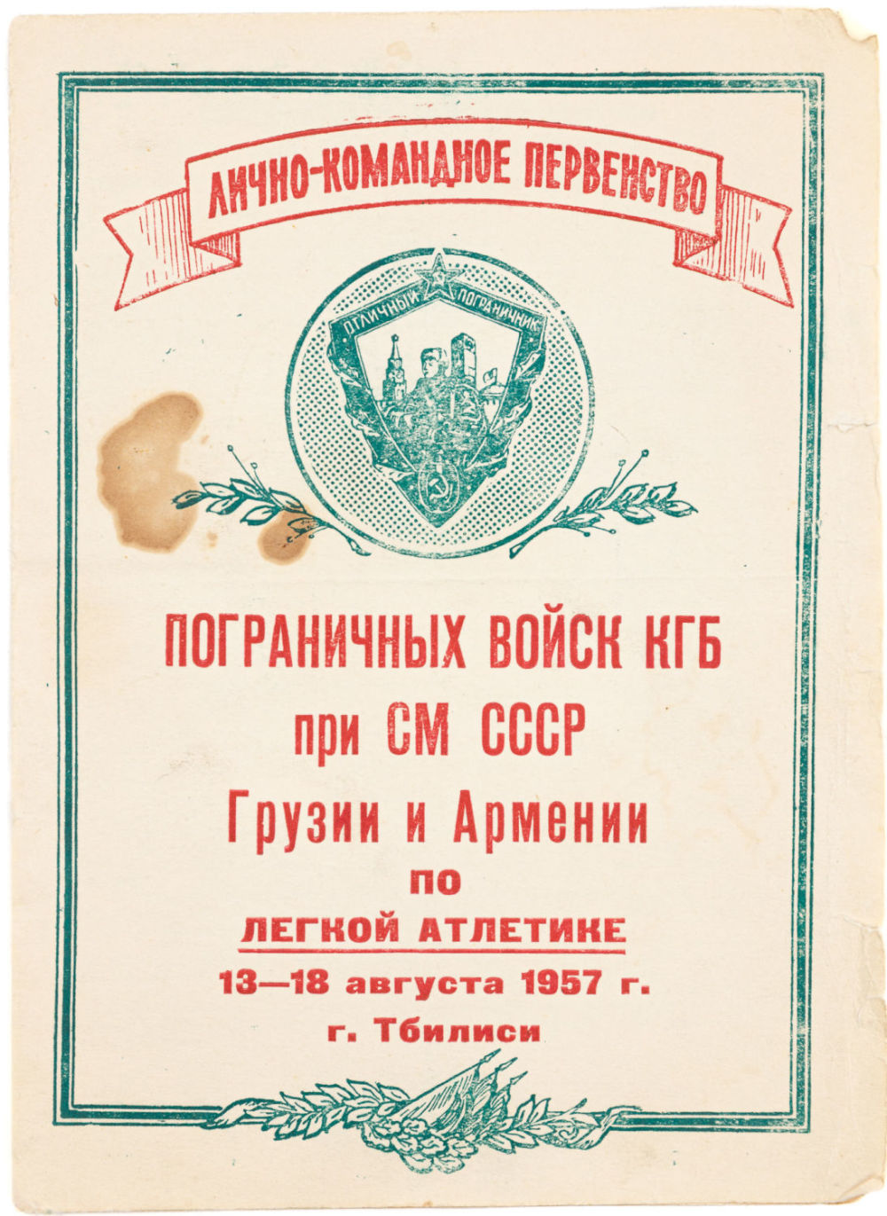 Буклет с результатами спортивных соревнований по легкой атлетике, проводимых в Тбилиси в 1957 г. между составами пограничных войск Грузии и Армении.