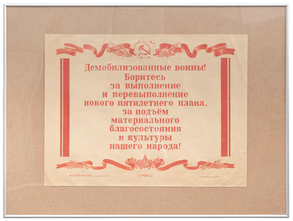 Надпись на плакате: «Демобилизованные воины! Боритесь за выполнение нового пятилетнего плана, за подъем материального благосостояния и культуры нашего народа!». По нижнему краю листа – выходные данные.