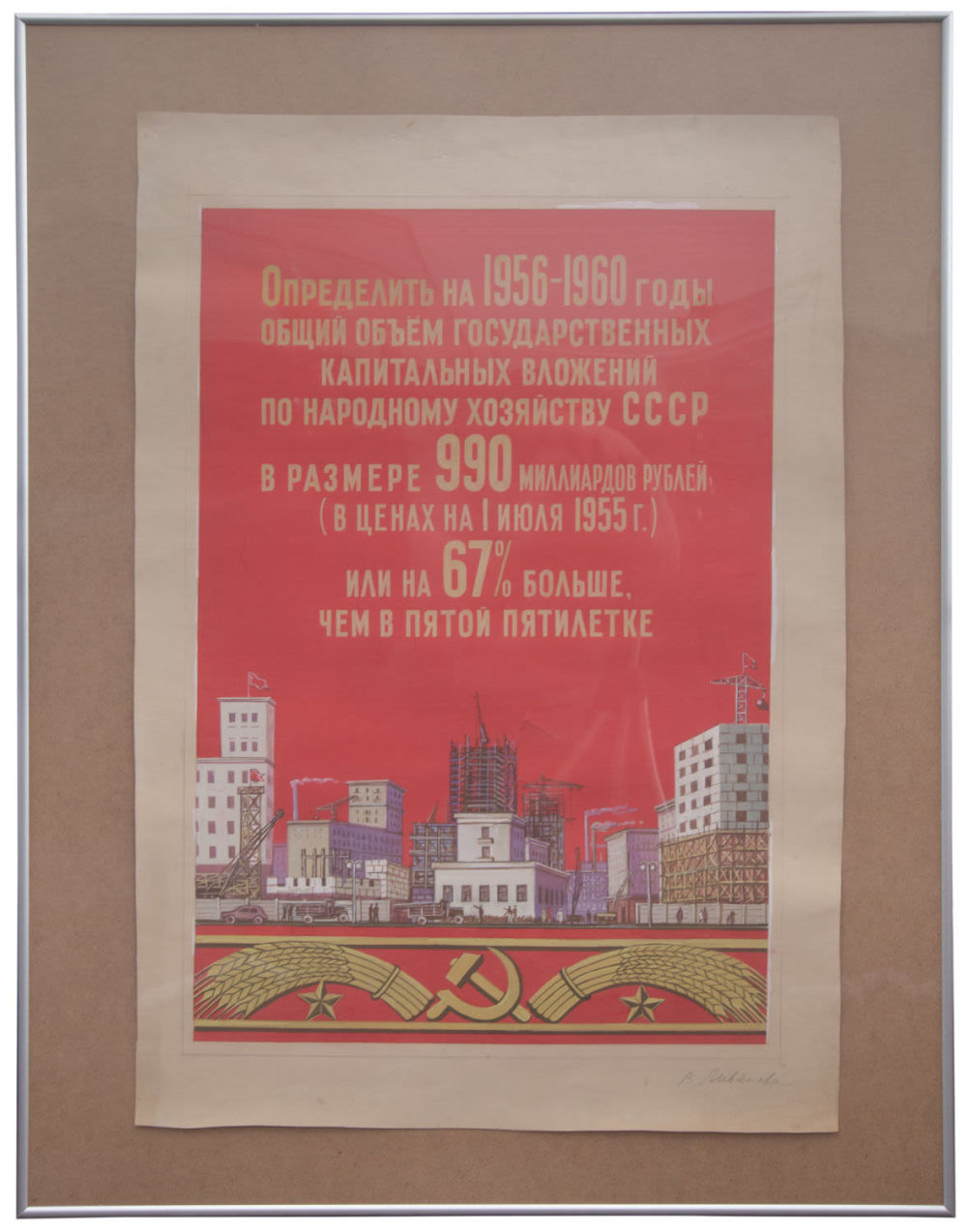 Надпись на плакате: «Определить на 1956–1960 годы общий объем государственных капитальных вложений по народному хозяйству СССР в размере 990 миллиардов рублей (в ценах на 1 июля 1955 г.) или на 67% больше, чем в пятой пятилетке».