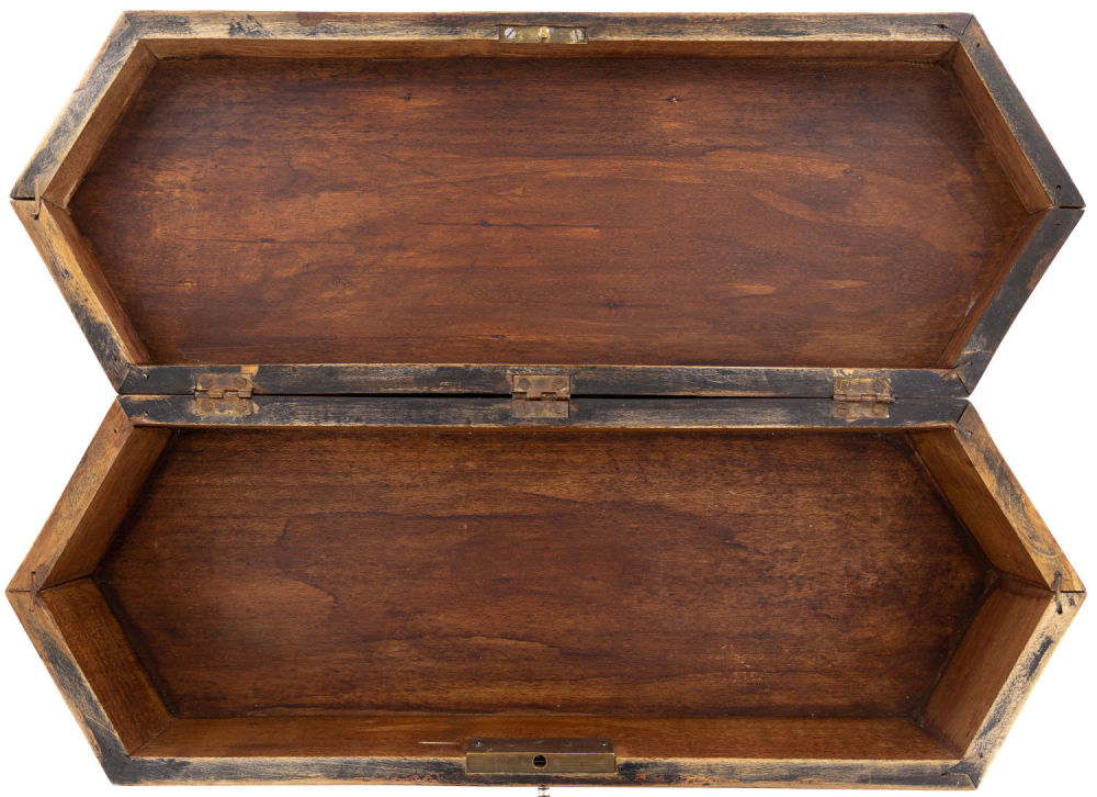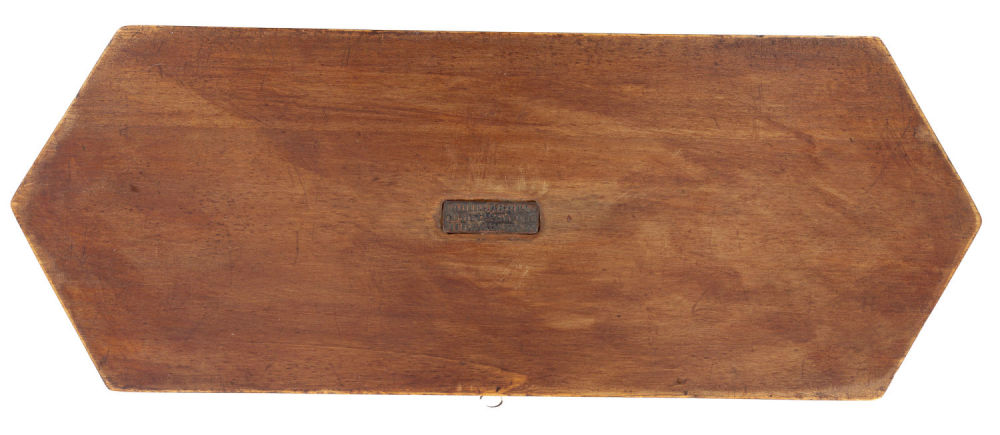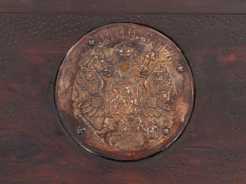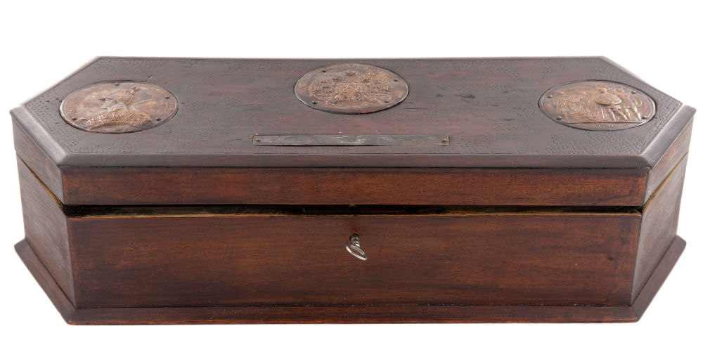 Россия. Дерево, морение, резьба; сплав металлов, штамповка, металлическая фурнитура. На основании – фирменный знак «"Александр" С. Петербург Невский пр. 11». Состояние: в хорошей сохранности; нестабильная работа запирающего механизма. Размеры: 38,5х14х9,5 см.