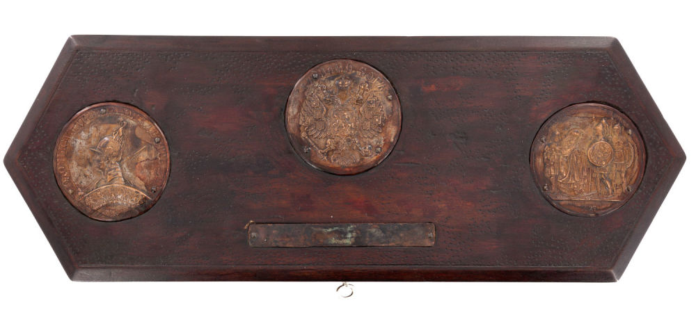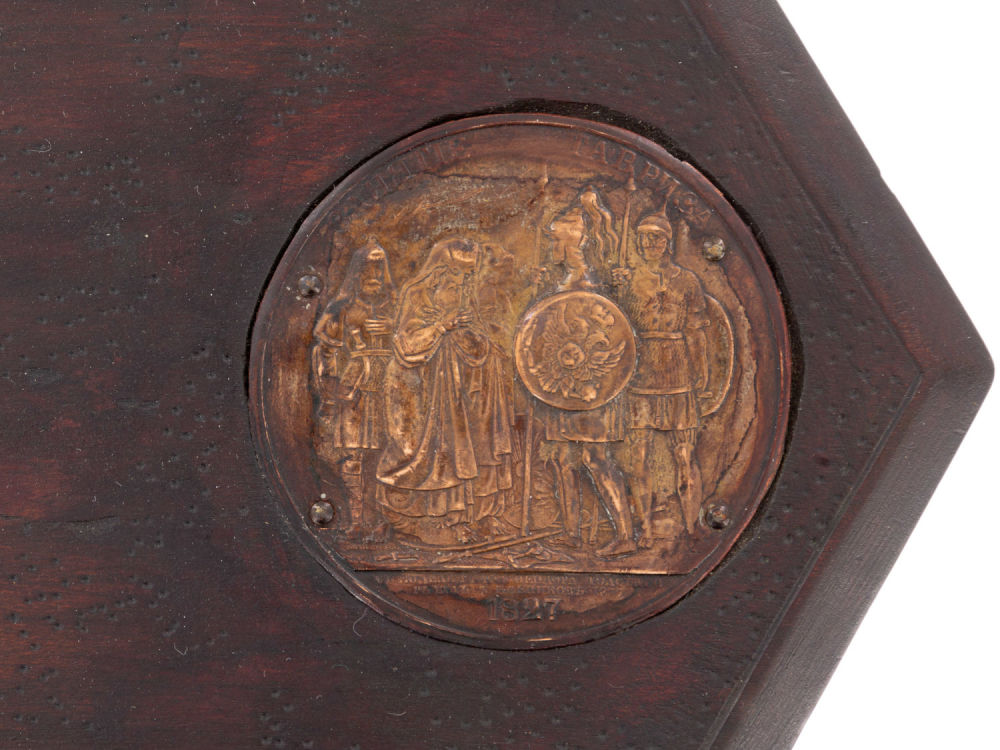 Граф Фёдор Петрович Толстой (1783–1873) – русский живописец, художник, мастер медальерного искусства и скульптор, представитель позднего классицизма, вице-президент Императорской Академии художеств, тайный советник. Медальоны Толстого — серия из 20 рельефов в духе классицизма, созданных художником Ф. П. Толстым после победы в Отечественной войне 1812 г. с аллегорическими сценами на темы войны 1812 г. и заграничных походов русской армии в 1813–1814 гг. Серия была начата в 1814-м, а закончена им в 1836 г. Медальоны пользовались большой популярностью, принеся своему автору широкую известность. Считается, что этот цикл — лучшее произведение русского медальерного искусства XIX в. На одном из рельефов Александр I изображён в образе Родомысла, увенчанный шлемом. Надпись под другим рельефом гласит: «Занятие Тавриза/СЪ МОДЕЛИ ГРАФА ѲЕОДОРА ТОЛСТАГО/РѢЗАЛЪ А: КЛЕПИКОВЪ 1839/1827».