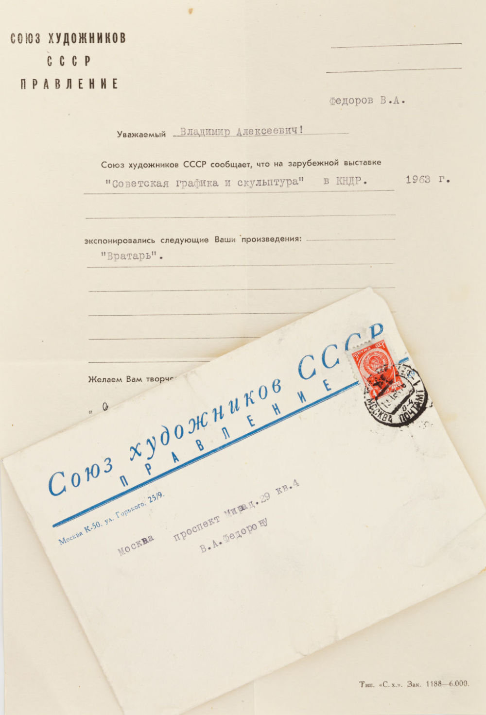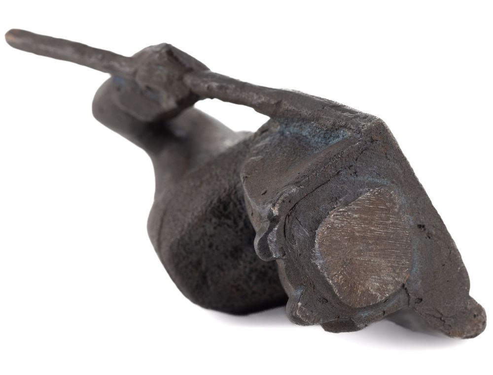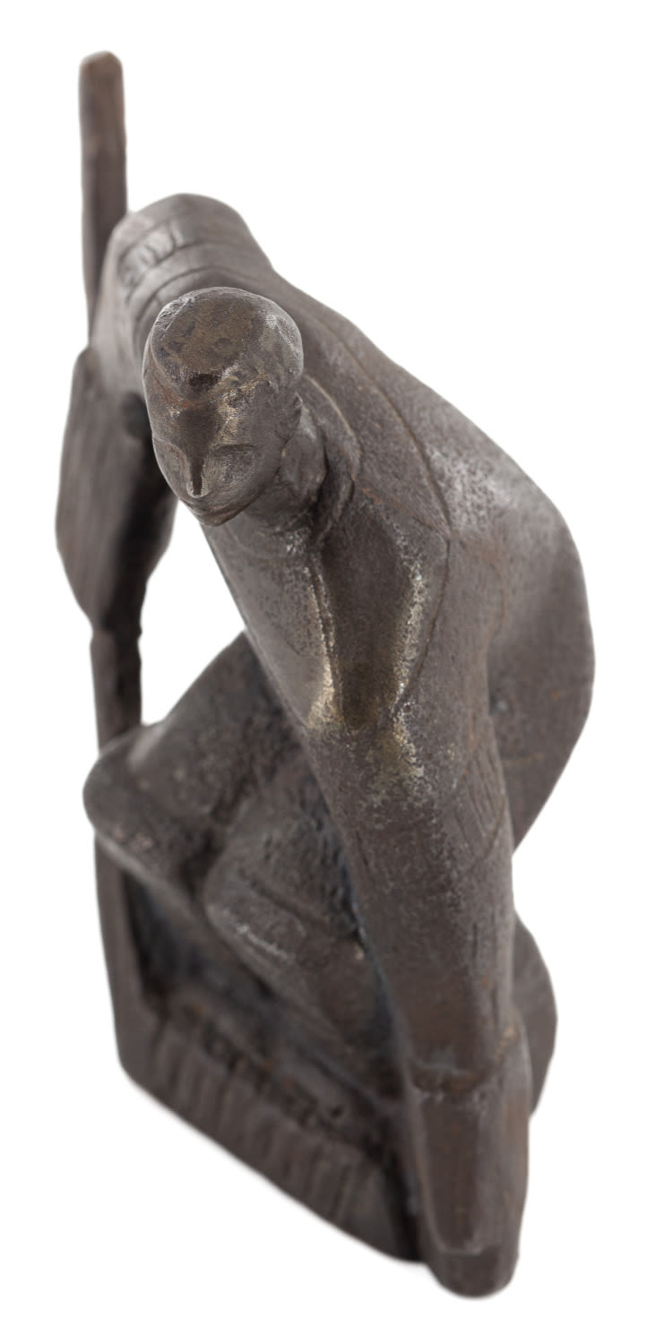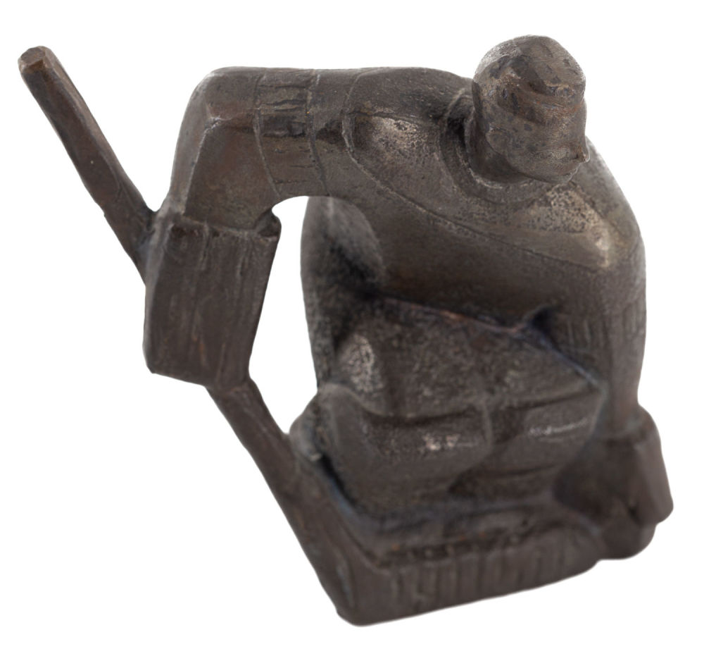 СССР. Сплав металлов, литье. Размеры: высота – 10 см. Состояние: в хорошей сохранности. К скульптуре приложен адрес от Союза художников СССР на имя скульптора от 9.01.1964 г.: «Уважаемый Владимир Алексеевич! Союз художников СССР сообщает, что на зарубежной выставке "Советская графика и скульптура" в КНДР 1963 г. экспонировались следующие Ваши произведения: "Вратарь". Желаем Вам творческих успехов! "9" января 1964 г. Отдел пропаганды Союза художников СССР».