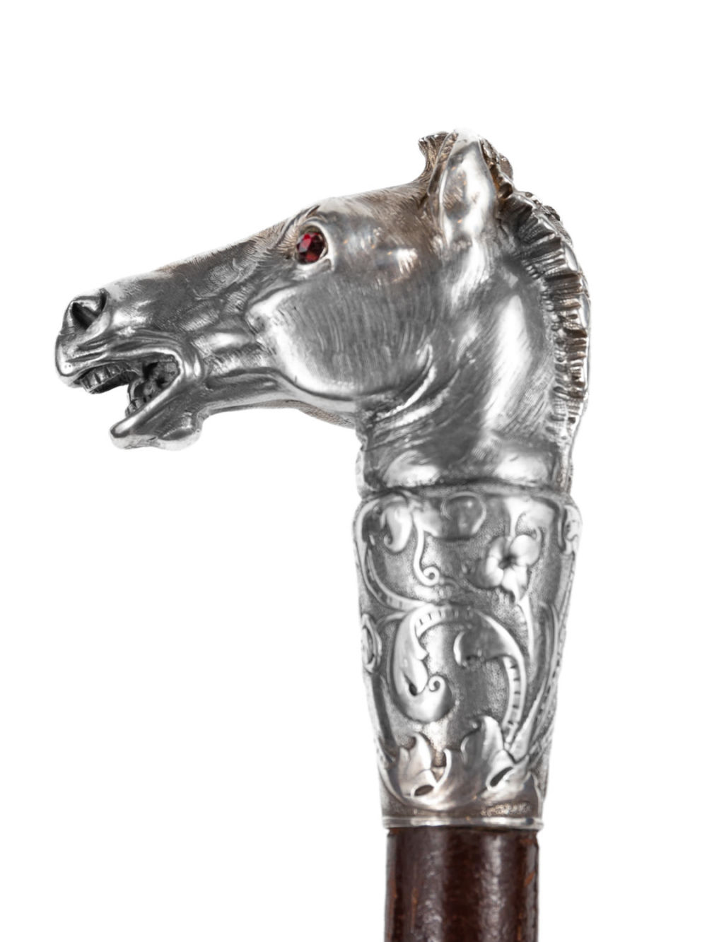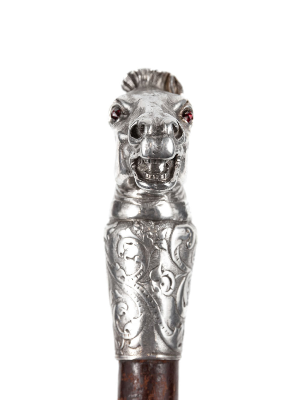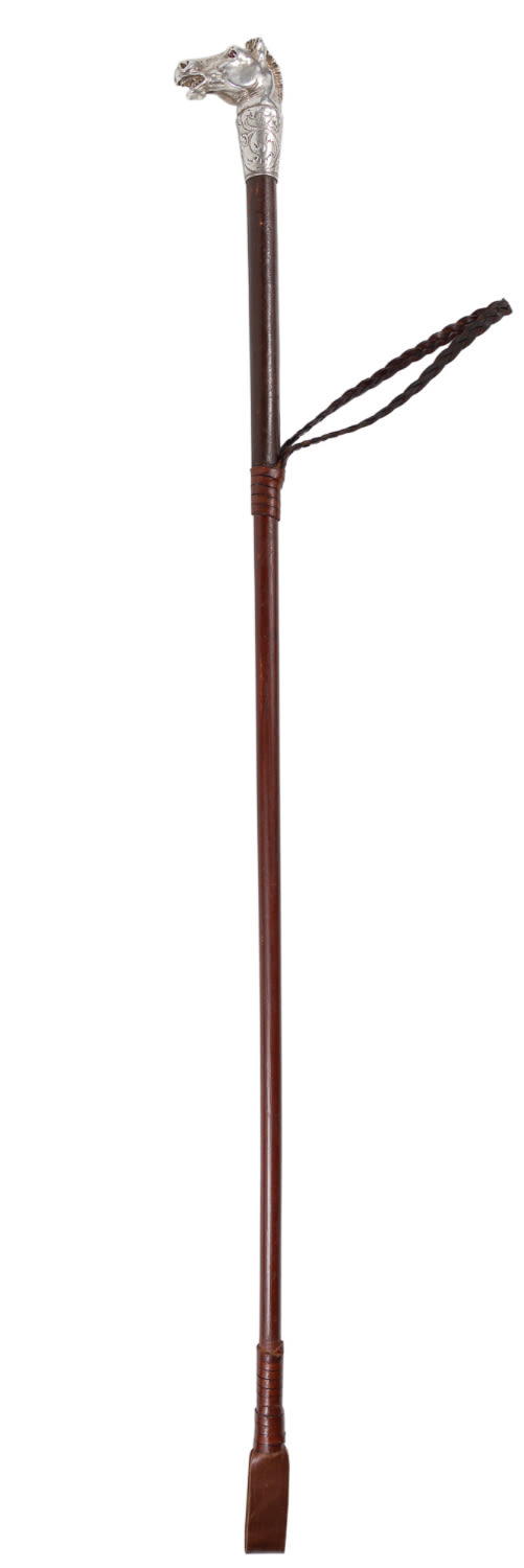 Верховая езда всегда слыла увлечением аристократии, и аксессуары для конного спорта нередко выполнялись на заказ. Тонко исполненная, анатомически верная голова коня на рукоятке представленного лота сообщает утилитарному предмету уникальность и изысканность.