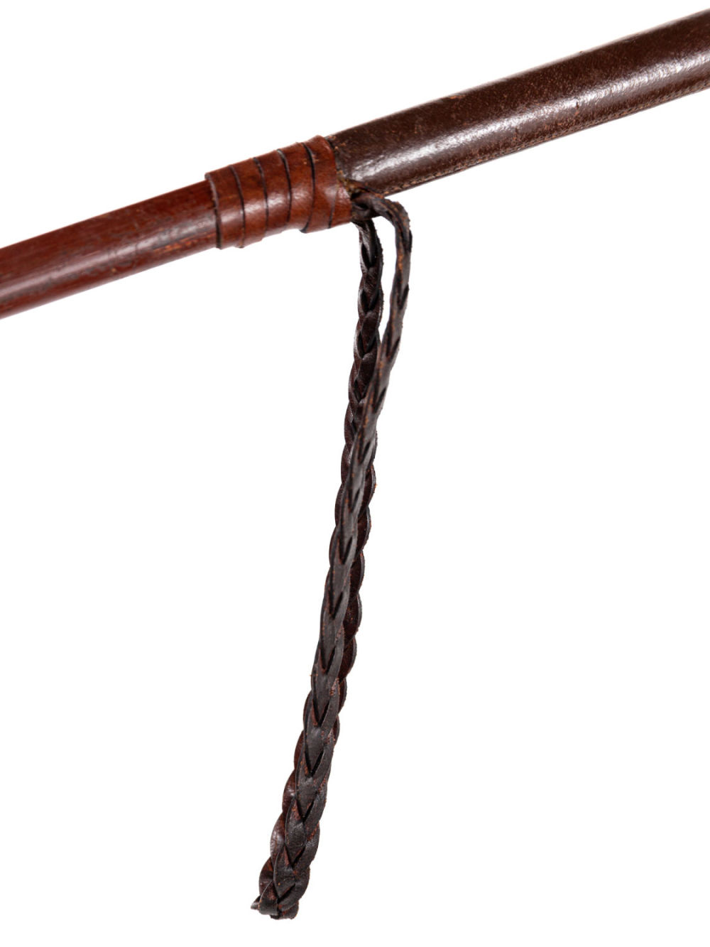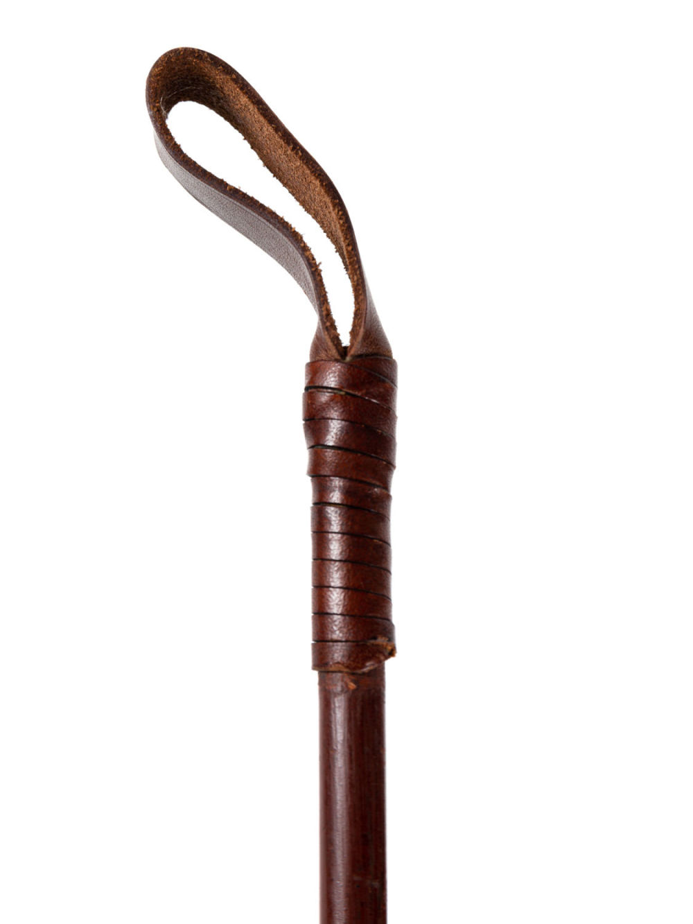 Европа, Германия (?). Серебро, дерево, кожа. Инкрустация вставками красного стекла. Состояние: в хорошей сохранности, оплетка и шлепок заменены. Размеры: длина – 78 см.