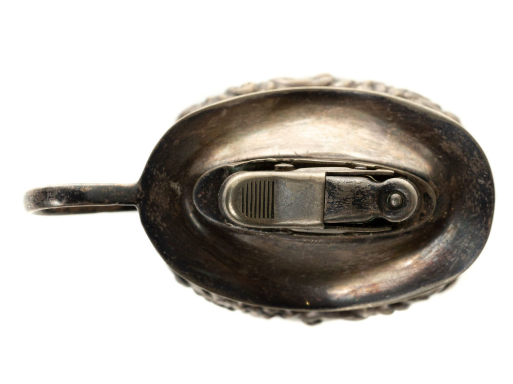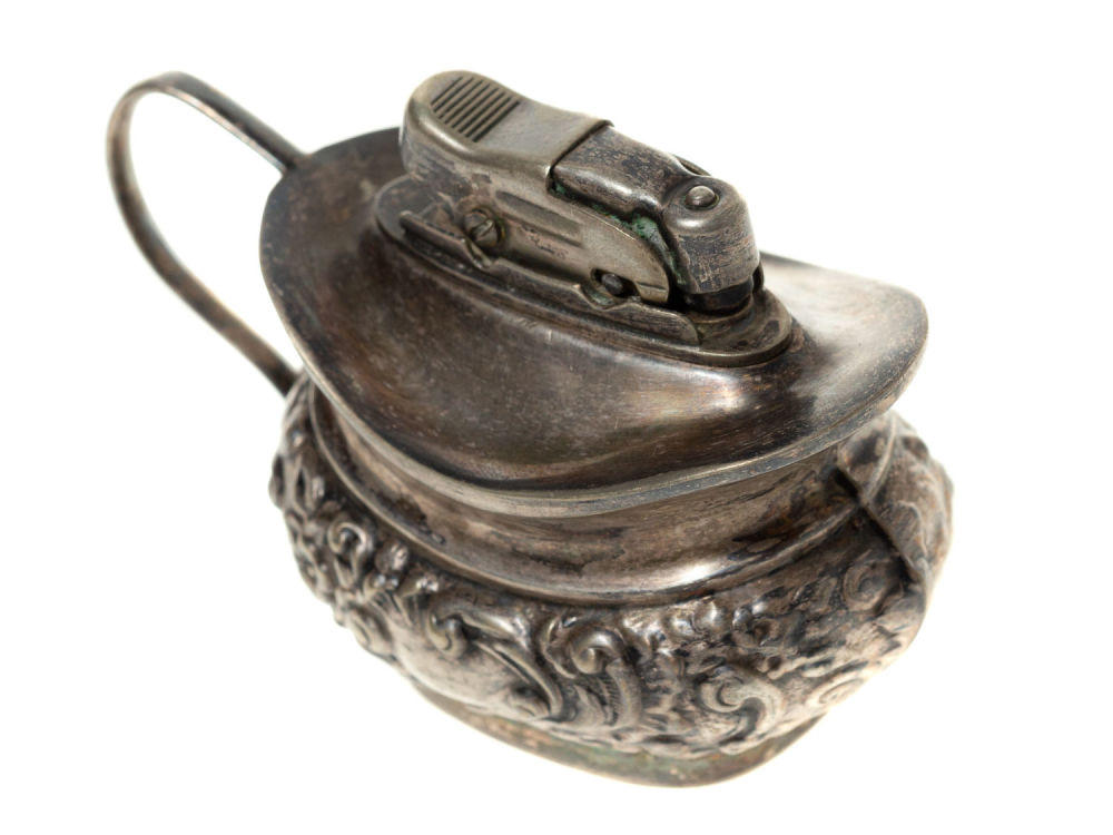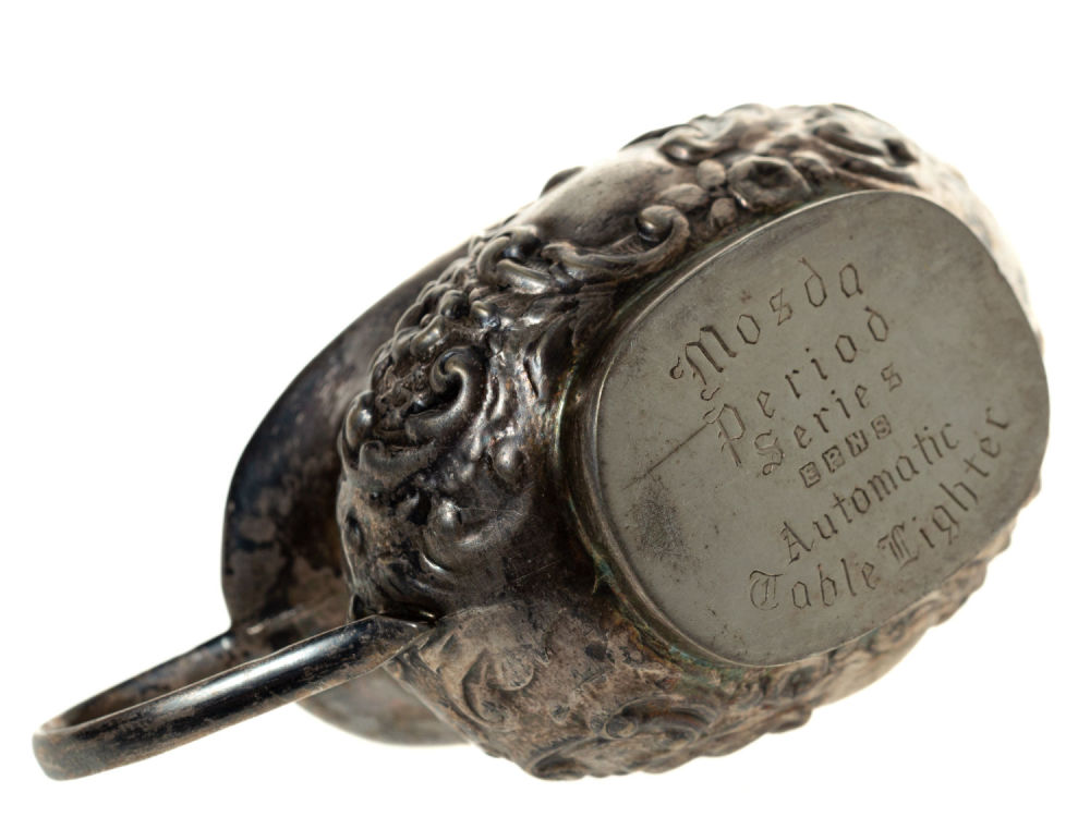 Англия. В рабочем состоянии. Сплав металлов, штамповка, посеребрение. На основании надпись: «Mosda Period series EPNS Automatic Table Lighter». Размеры: высота – 6 см; длина – 8,5 см. Состояние: в хорошей сохранности, потемнение металла, незначительные следы бытования.