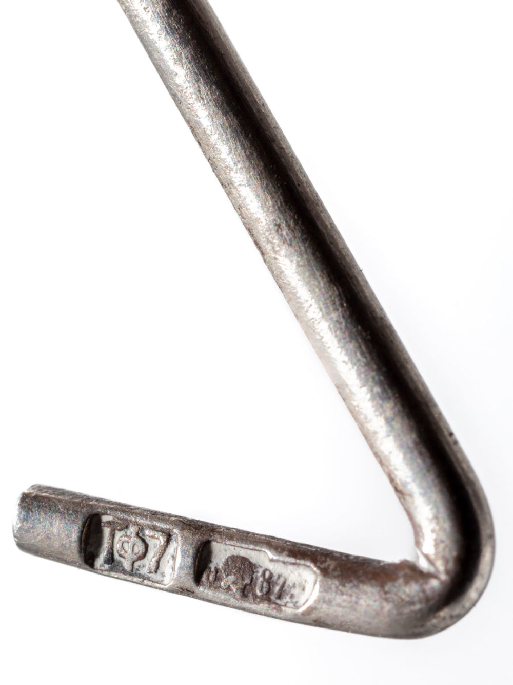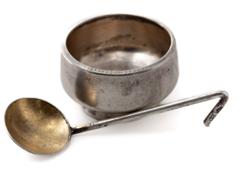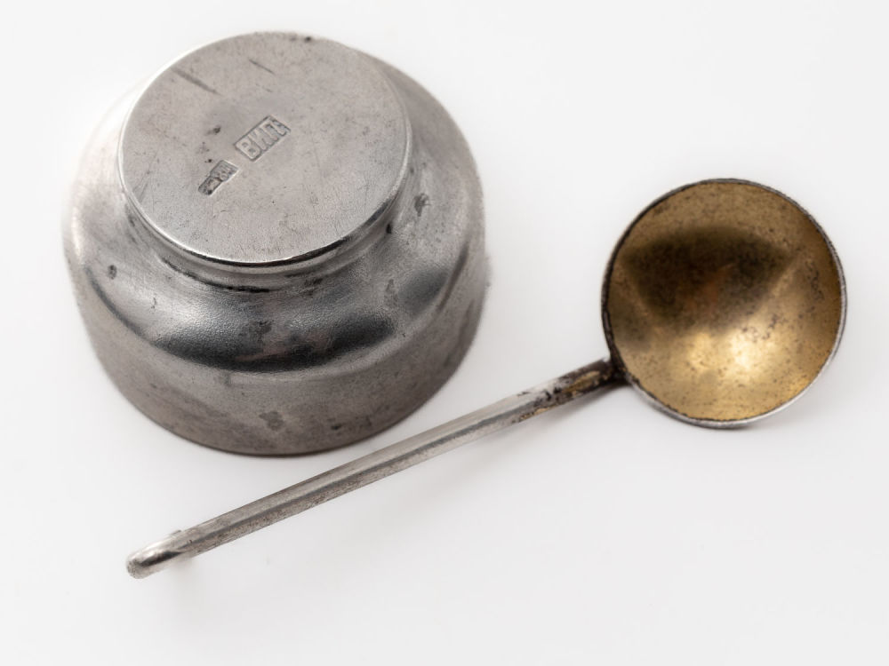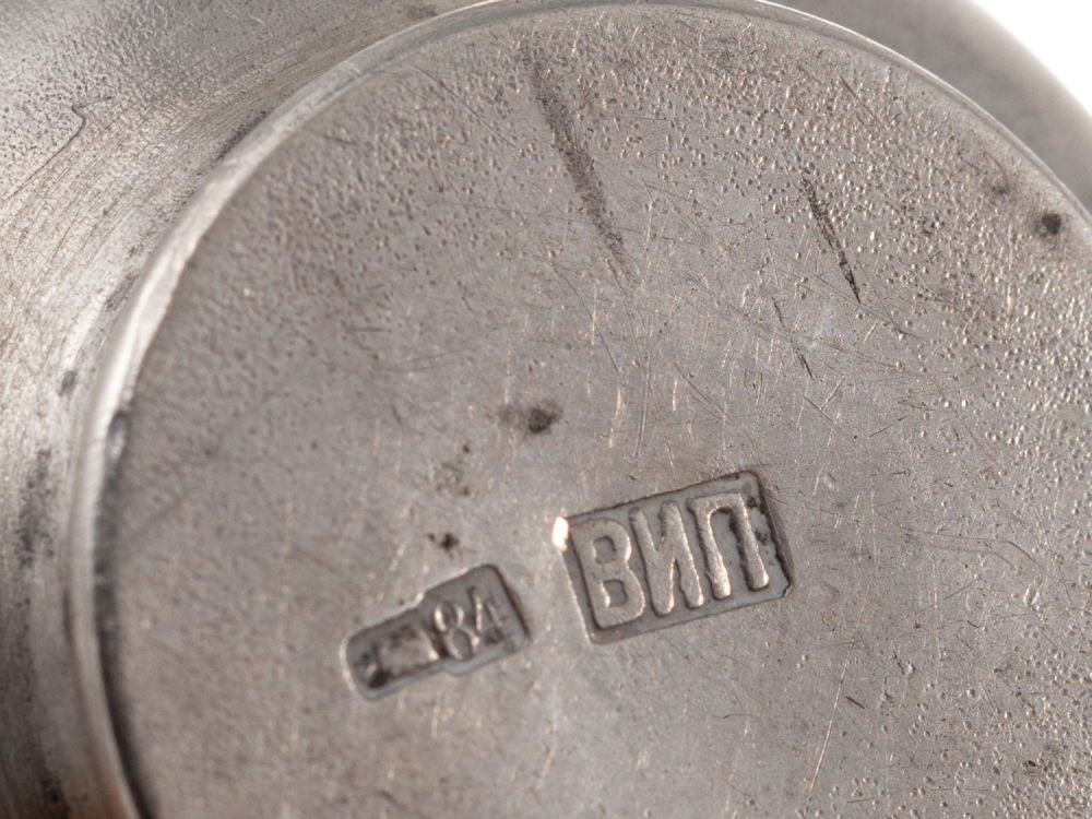 Российская империя, Москва; СССР, Таллин. Солонка – серебро, литье; ложка – серебро, литье, золочение. Клейма: солонка – пробирное «84» с головой в кокошнике, обращенной вправо, и литерой «Δ» в щитке в форме лопатки; именник «ВИП» в прямоугольном щитке (Пуляткин В.И., владелец мастеской серебряных изделий); ложка – пробирное «87(5?)» с головой рабочего, обращенной вправо, и литерой «υ» в щитке в форме лопатки; клеймо фабрики «ТФ7» в прямоугольном щитке (Таллинская ювелирная фабрика, Таллинская пробирная инспекция). Размеры: солонка: высота – 1,7 см, диаметр – 2,8 см; ложка: длина – 5,5 см. Вес: солонка – 9,2 г; ложка – 3,3 г. Состояние: в хорошей сохранности, потемнение серебра, незначительные следы бытования.