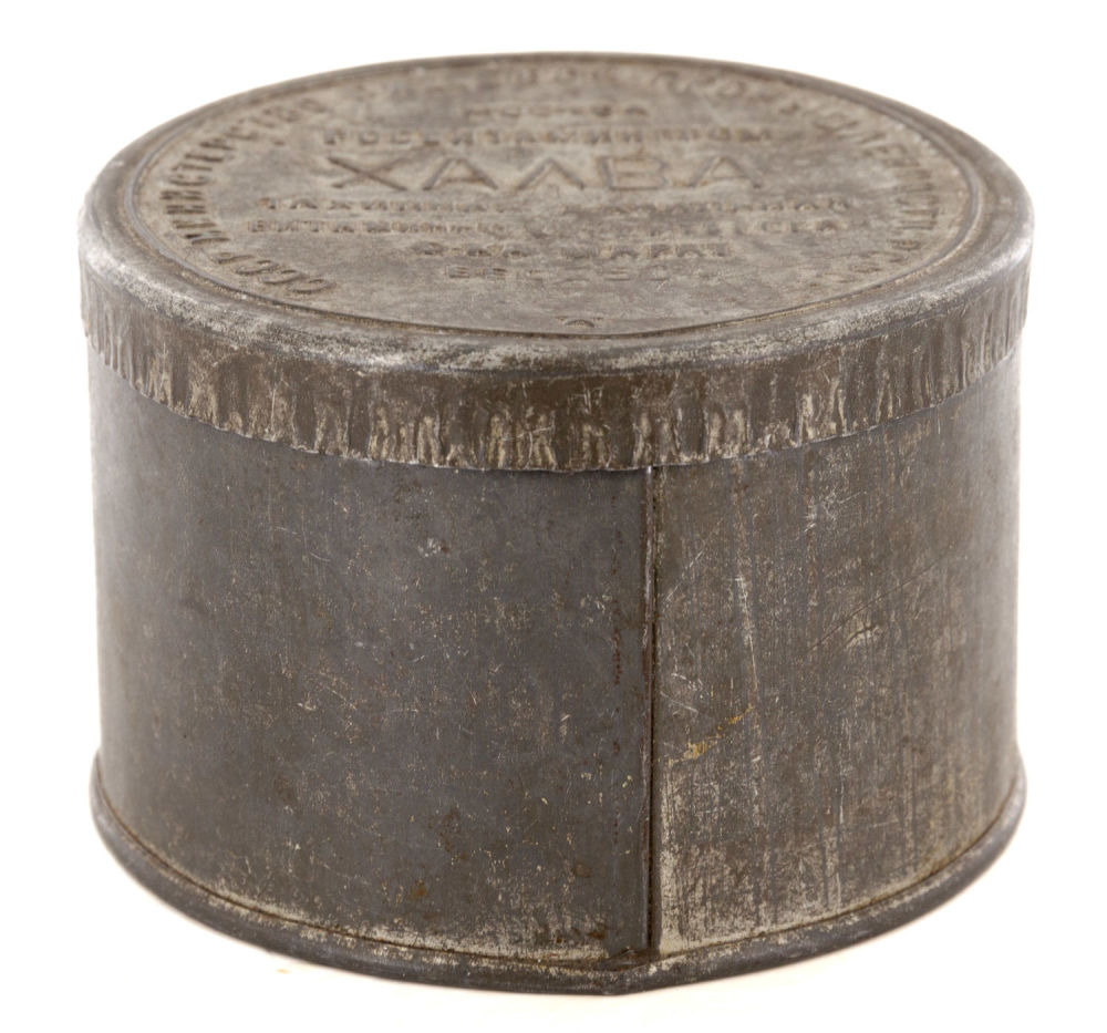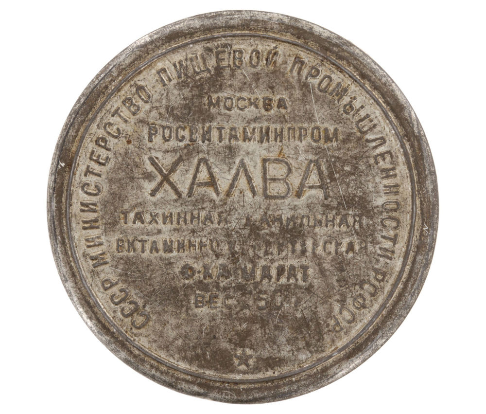 СССР. Жесть, рельеф, фабричное производство. Надписи на крышке: «СССР Министерство пищевой промышленности РСФСР. Москва Росвитаминпром Халва тахинная витаминная кондитерская ф-ка Марат Вес 250 г». Банка под крышкой заклеена фольгой. Размеры: диаметр – 8,3 см; высота – 5,7 см. Состояние: в хорошей сохранности, следы бытования.