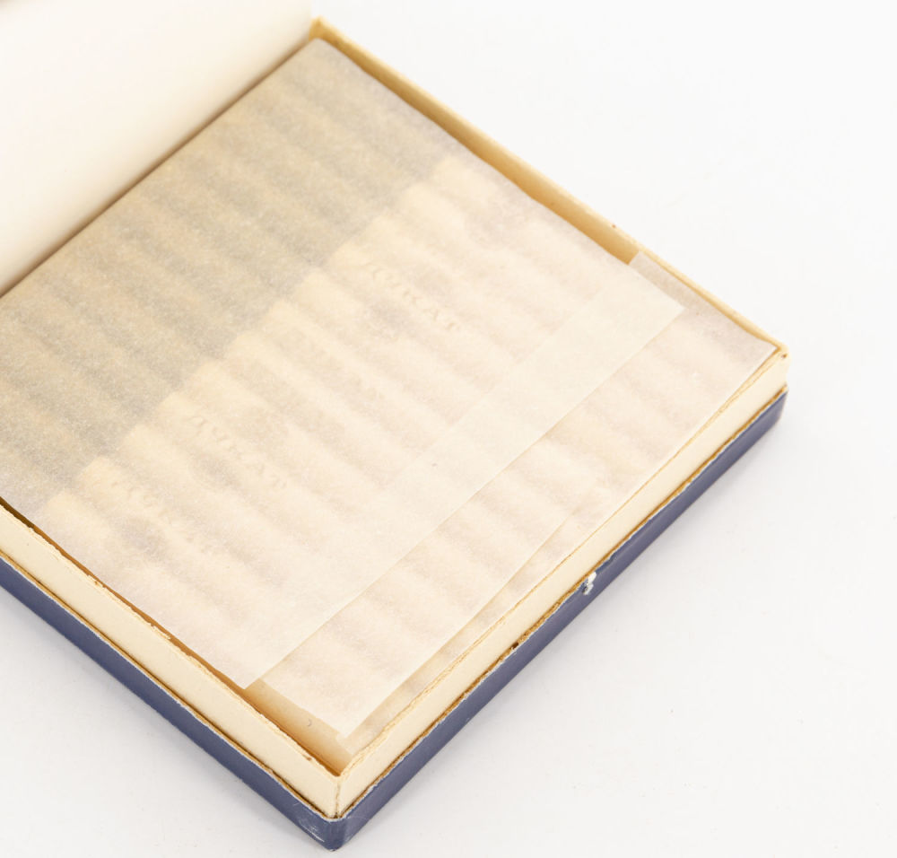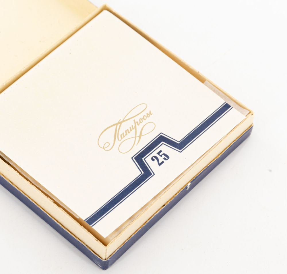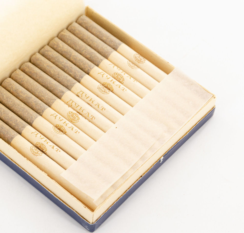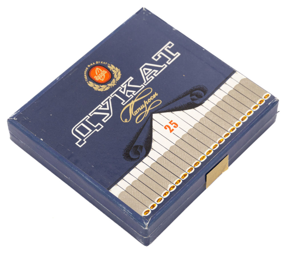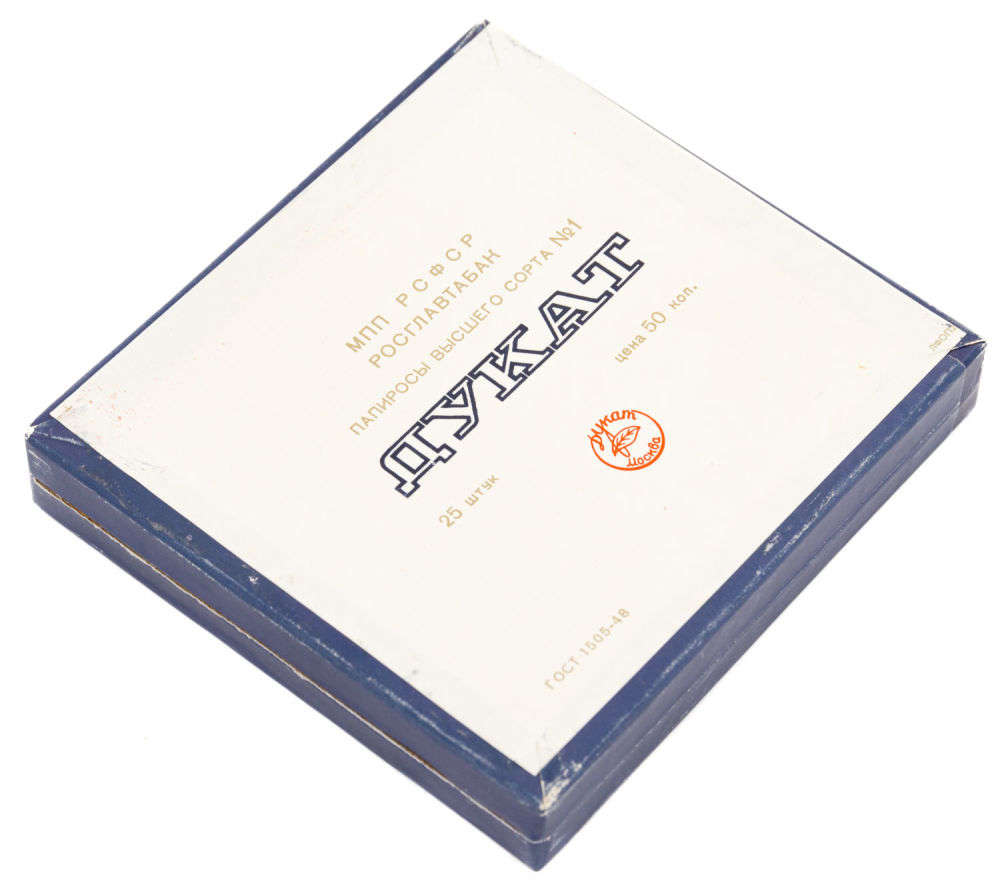 СССР. Бумага, картон, калька, печать; папиросы, фабричное производство. Надписи на крышке: «Табачная ф-ка Дукат», «Дукат папиросы», «25». Надписи на основании коробки: «МПП РСФСР РОСГЛАВТАБАК Папиросы высшего сорта №1 Дукат 25 штук цена 50 коп.», «ГОСТ 1505-48». Размеры: 11,2х12х2,1 см. Состояние: в хорошей сохранности, незначительные потертости коробки.