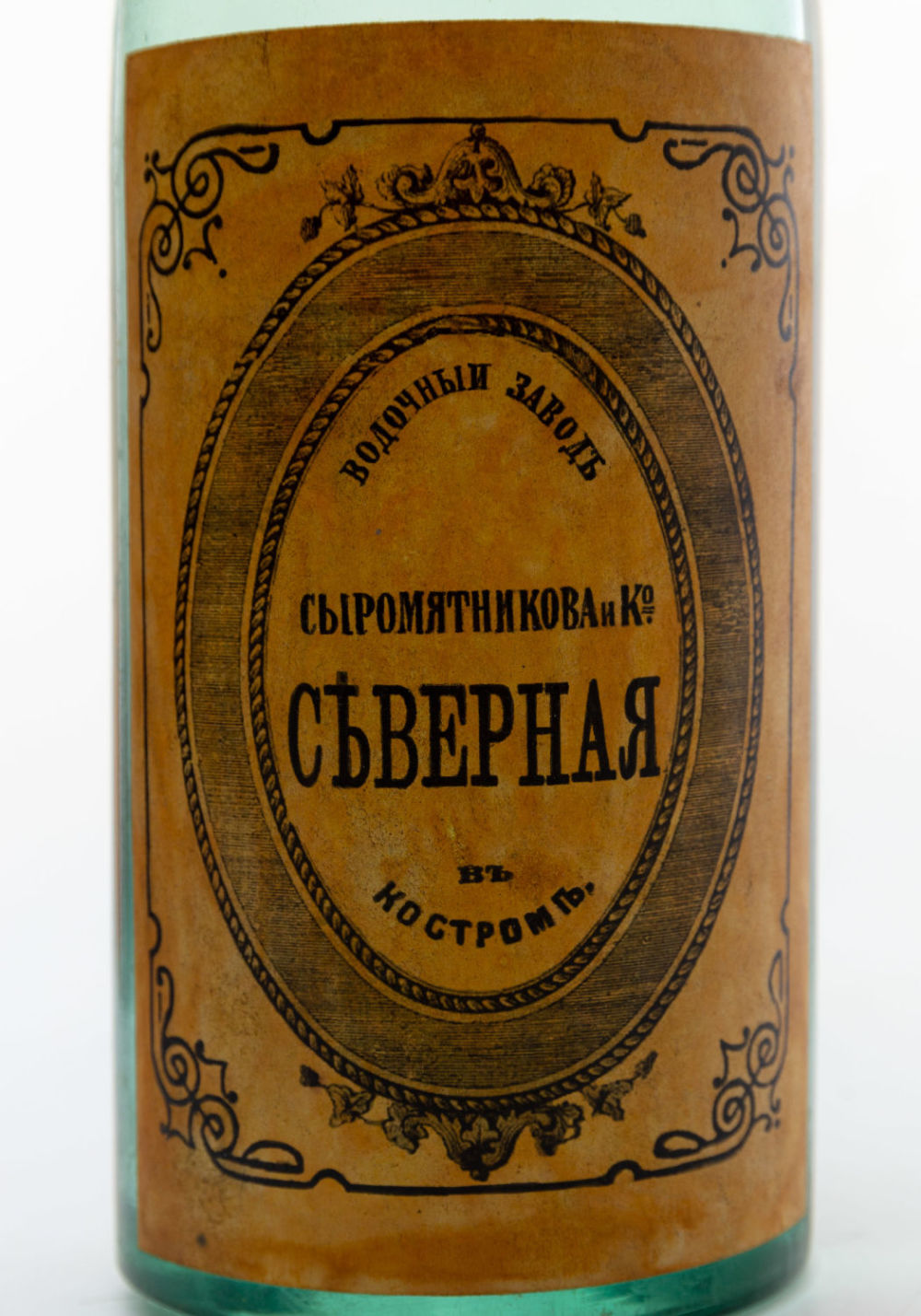 Российская империя, г. Кострома. Водочный завод Сыромятникова и Ко. Надпись на этикетке: «Водочный завод Сыромятникова и Ко. Сѣверная въ Костромѣ». Запечатанная бутылка прозрачного стекла с прозрачной жидкостью; вогнутое основание; пробка покрыта неповрежденной фольгой. Состояние: в хорошей сохранности, незначительные загрязнения этикетки и бутылки. Размеры: высота – 44 см.