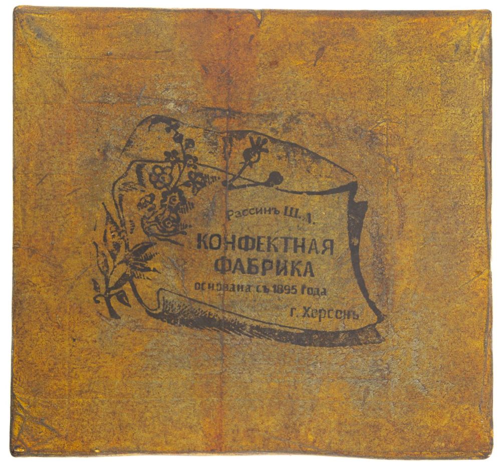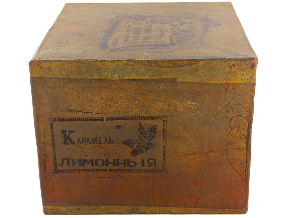 Российская империя, г. Херсон. Дерево, печать, бумага, фабричное производство. По сторонам коробки надписи: «Рассинъ Ш.Л. Конфектная фабрика основана съ1895 года г. Херсонъ», «Карамель Лимонныя». Коробка запечатана заводским способом. Состояние: в хорошей сохранности, следы бытования, загрязнения. Размеры: 18,2х19,4х14,7 см.