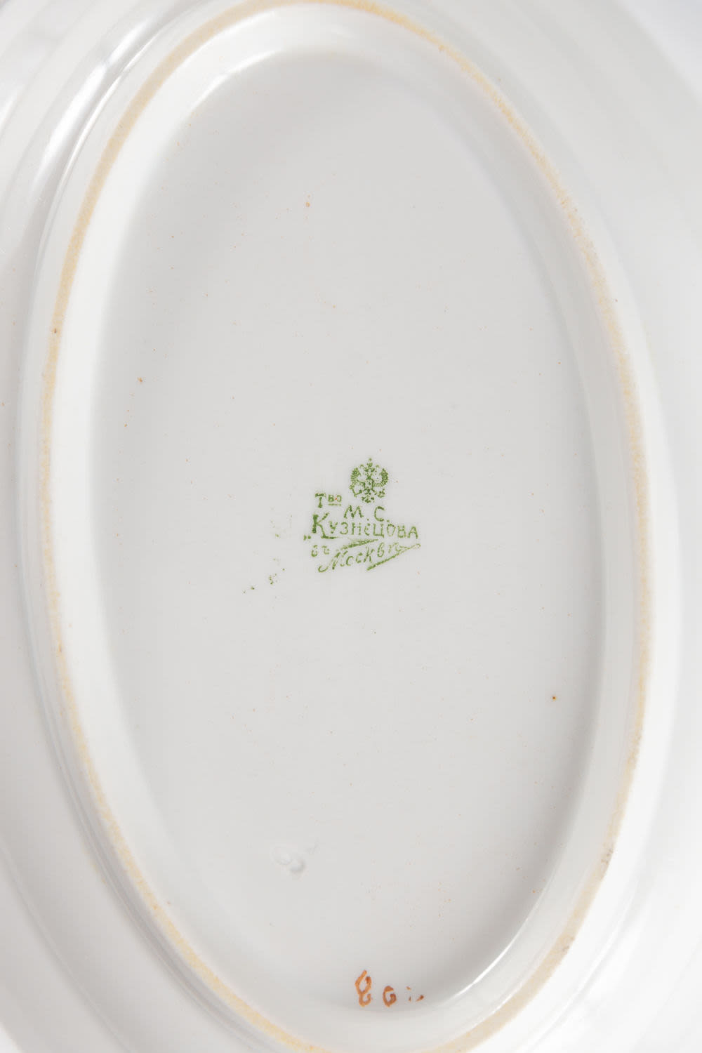 Россия, Москва. Фарфор, деколь. Марка зеленым: «Т-во М.С. Кузнецова въ Москве» и цифры оранжевым «308». Состояние: в хорошей сохранности, следы бытования, незначительные потертости узора. Размеры: длина – 23 см.