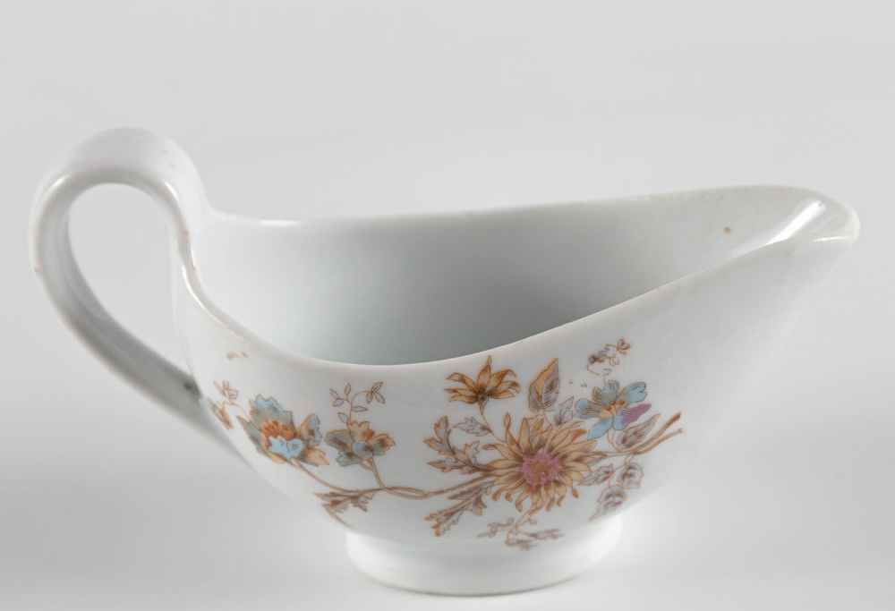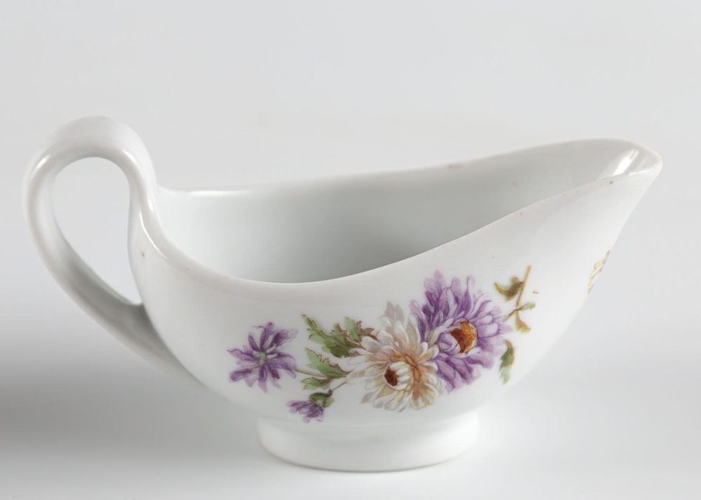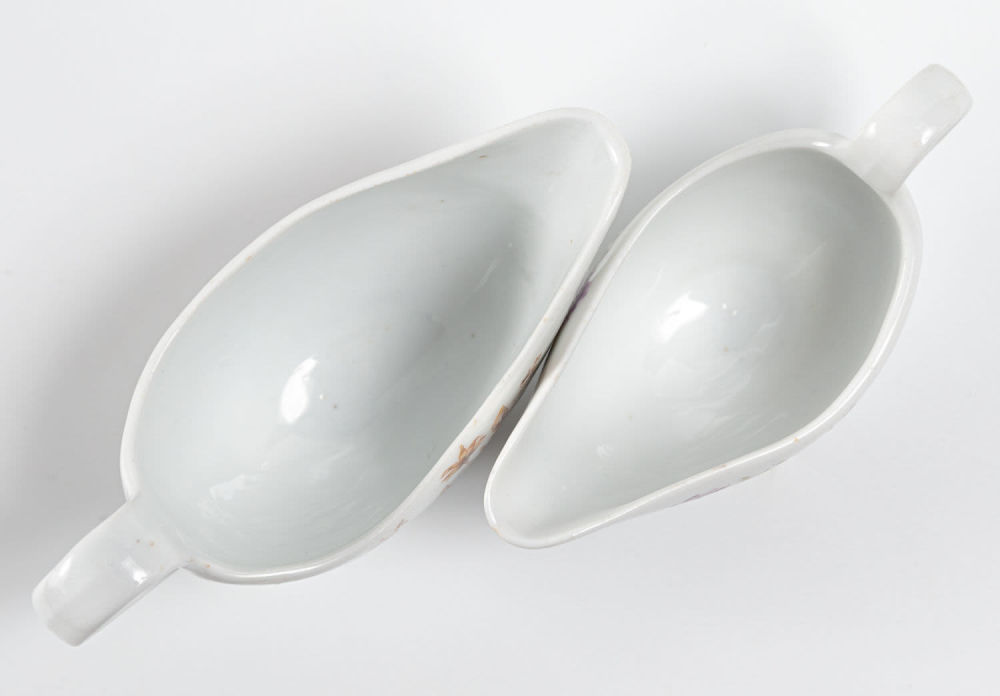 Россия, Москва. Соусник с оранжевыми цветами. Фарфор, деколь. Марка зеленым: «Т-во М. С. Кузнецова въ Москве». Состояние: в хорошей сохранности, незначительные следы бытования. Размеры (по ручке): 8,6х14,3 см. Соусник с сиреневыми и белыми цветами. Фарфор, деколь с подрисовкой. Марка зеленым: «Т-во М.С. Кузнецова въ Москве». Состояние: в хорошей сохранности, незначительный скол на носике. Размеры (по ручке): 7,3х12,9 см.