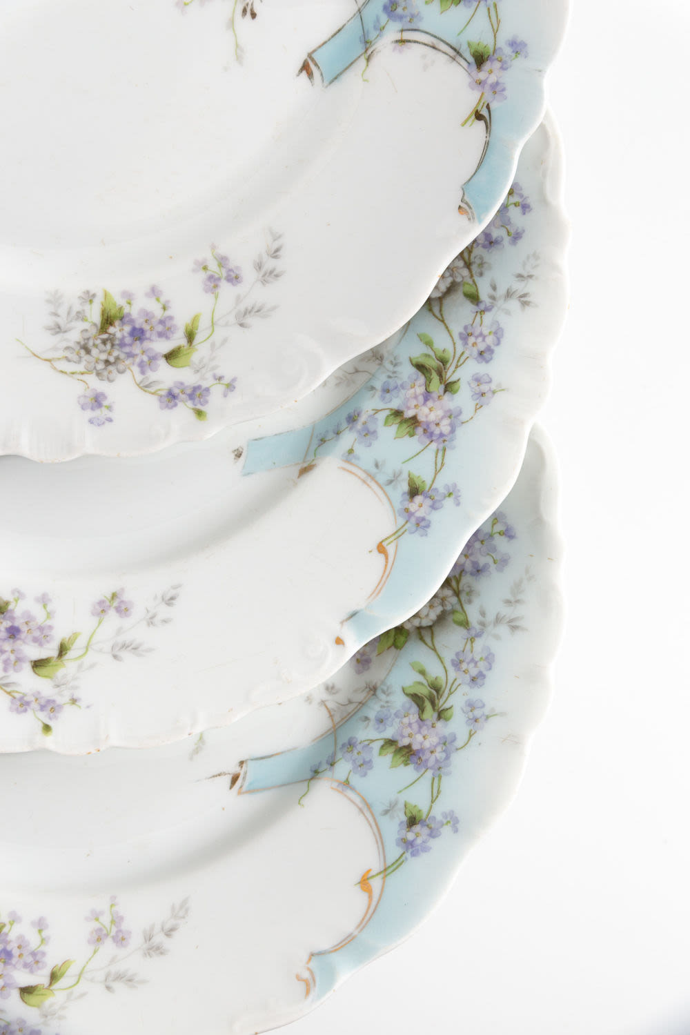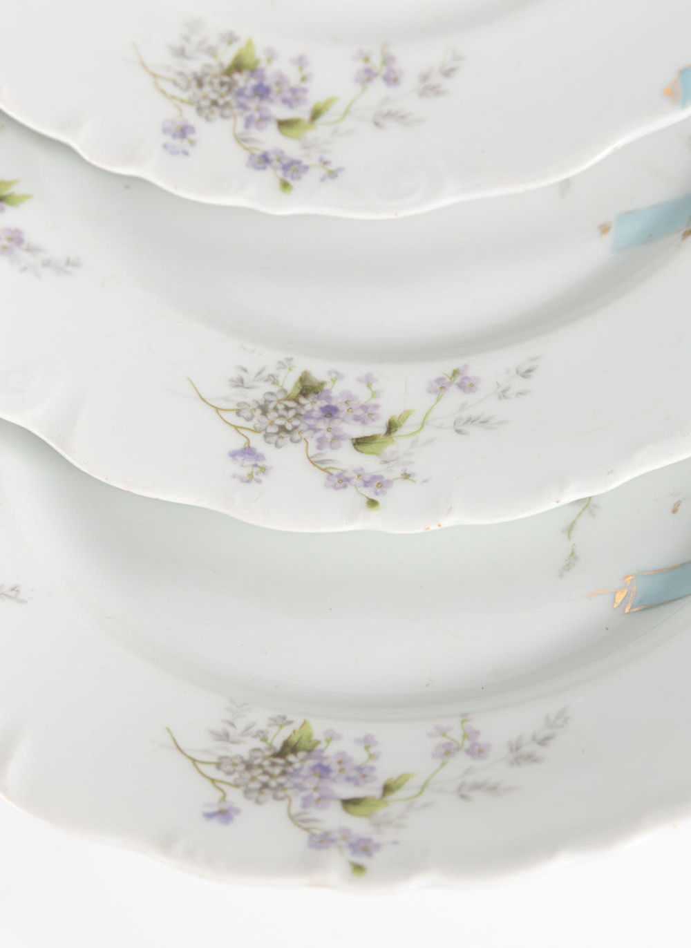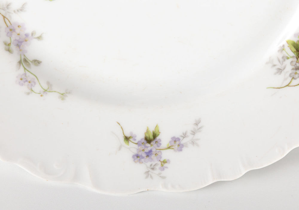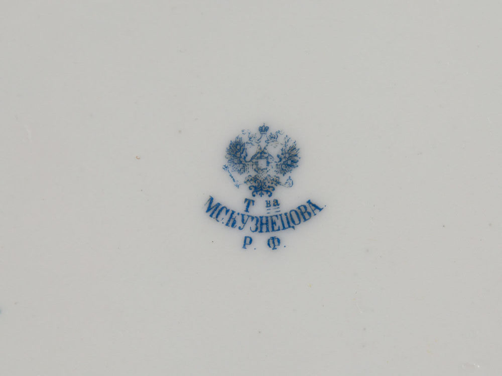 Россия. Т-во М.С. Кузнецова. Фарфор, деколь с подрисовкой, золочение. Марка синим: «Т-во М.С. Кузнецова Р. Ф.» Состояние: в хорошей сохранности, на бортах тарелок единичные сколы, следы бытования, незначительные утраты золочения. Размеры: диаметр – 24,3 см. «Товарищество производства фарфоровых, фаянсовых и майоликовых изделий М.С. Кузнецова» было основано в 1887 г. М.С. Кузнецов следил за производством, внедрял новые технологии, отправлял мастеров зарубеж для обучения новым методам работы. Благодаря этому предприятие заняло лидирующие позиции в России. После 1917 г. предприятие было национализировано (кроме фабрики в Риге).