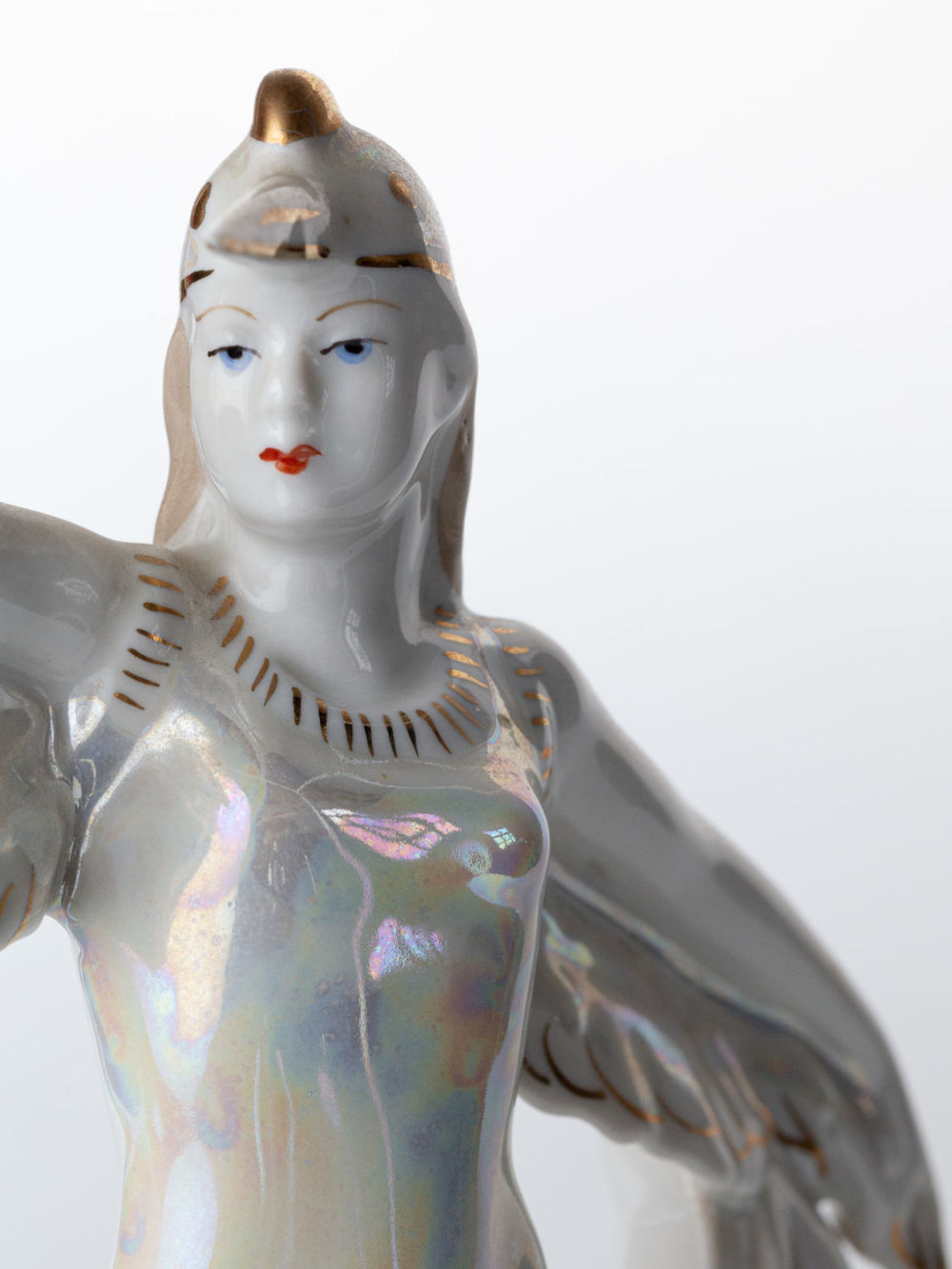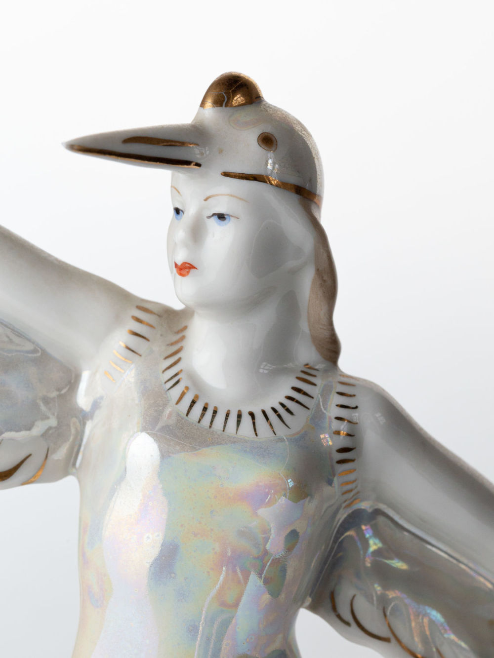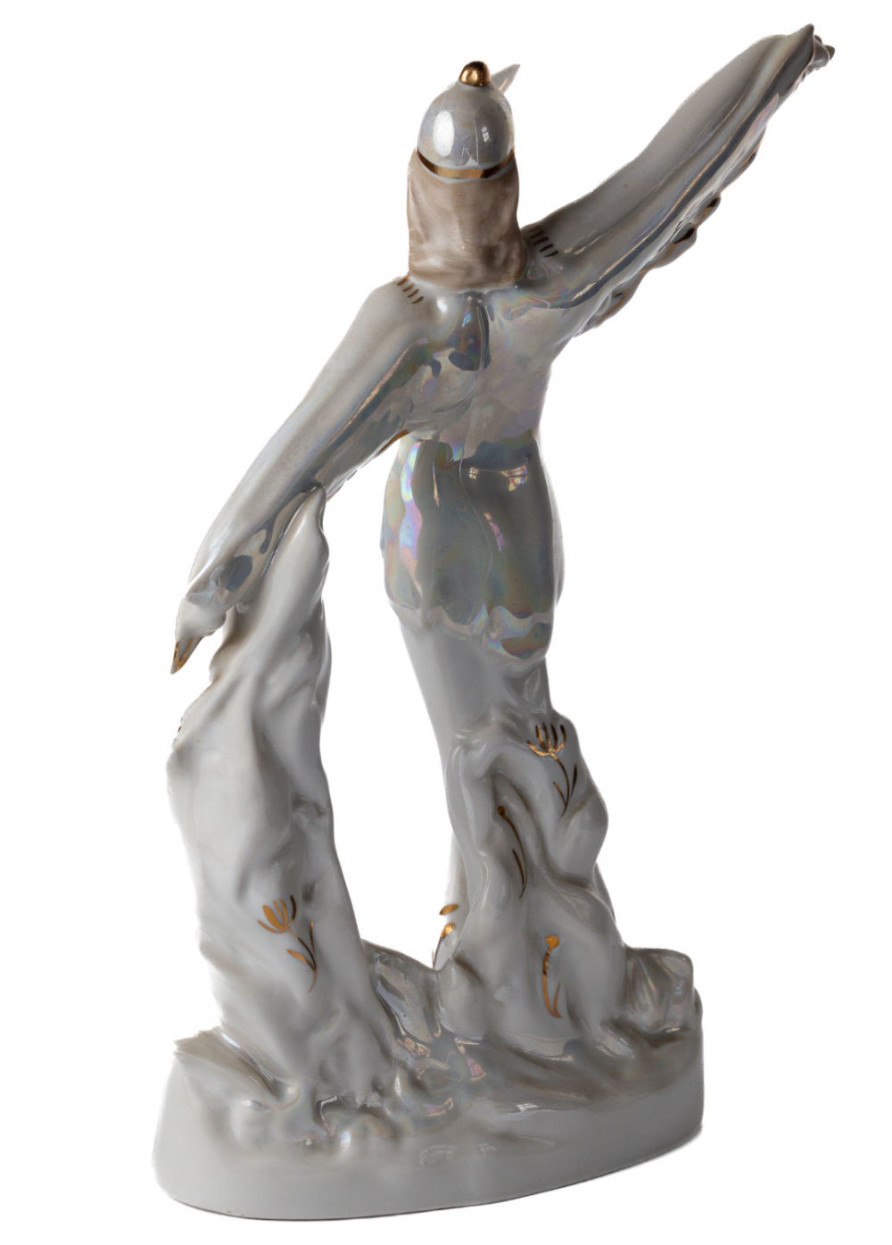 СССР. Дмитровский фарфоровый завод. Фарфор, люстр, полихромная роспись, роспись золотом. Марка – красным на основании: «ДФЗ Вербилки». Состояние: в хорошей сохранности. Размеры: высота – 24,5 см; ширина основания – 13 см. Автор модели – М.А. Интизарян. Аналогичная скульптура под названием «Балерина-журавль» представлена в каталоге Пелинский И.А., Сафонова М.А. «Советский фарфор 1917–1991: иллюстрированный справочник-определитель с марочником заводов и ценами», стр. 156.