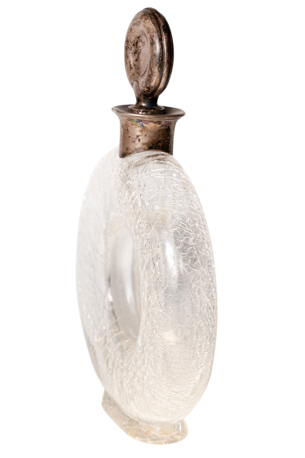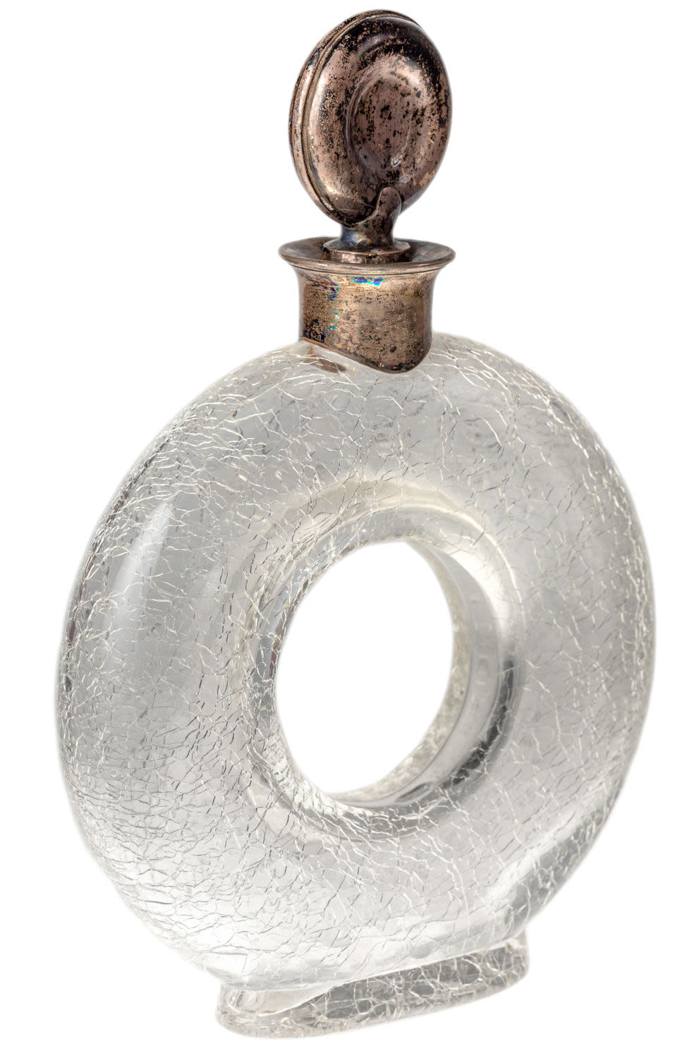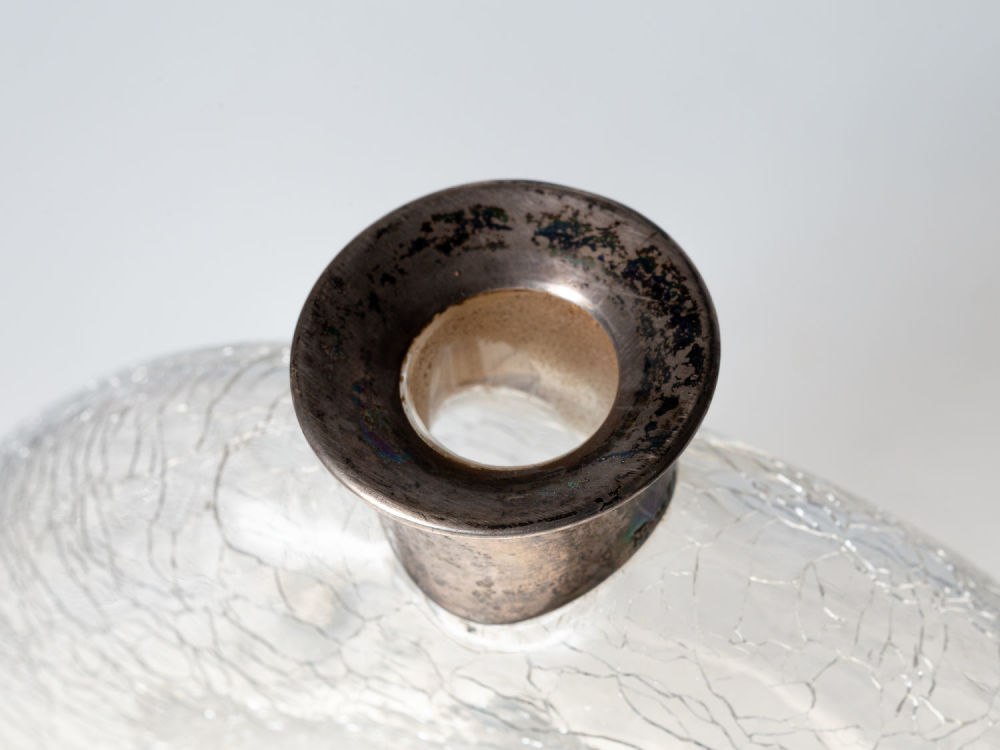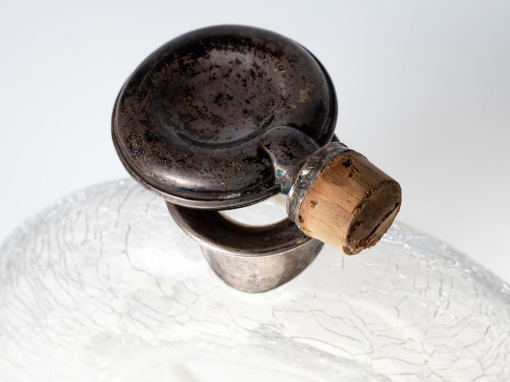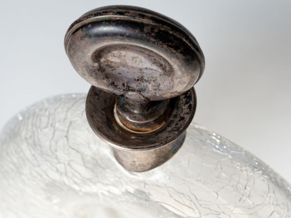 Германия, Хайльбронн. Стекло, серебро, пробка. Клейма на крышке и горлышке: «MT» (клеймо мастерской Adolf Mogler), «835», изображение короны и полумесяца (национальное клеймо Германии с 1886 г.), «17». Размеры: высота – 22,5 см; ширина – 15 см. Состояние: в хорошей сохранности, потемнение серебра, патина.