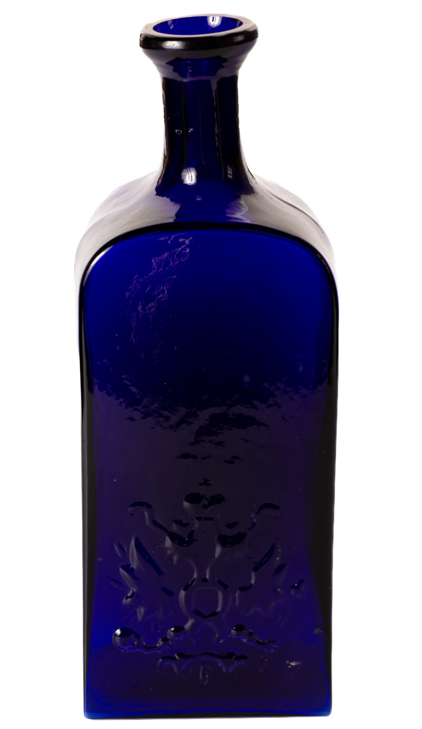 Российская империя. Кобальтовое стекло, штамповка. На тулове с одной стороны изображение двуглавого орла, с другой – надпись: «1865 г» и изображения двух медалей императорских выставок. Размеры: высота – 21 см, ширина – 7,3 см. Состояние: в хорошей сохранности.