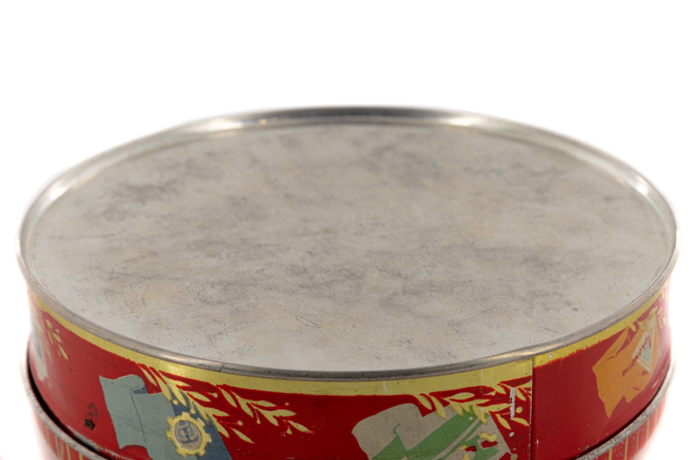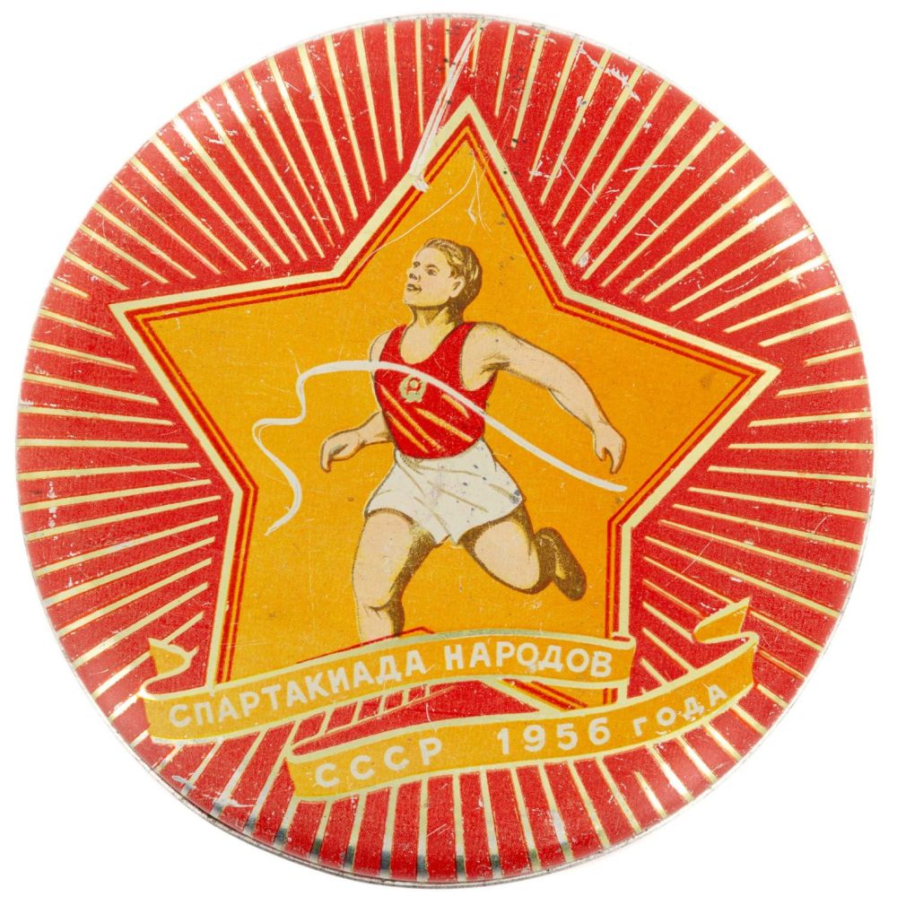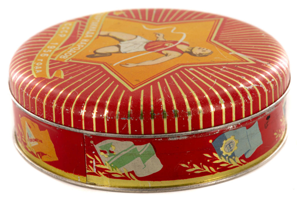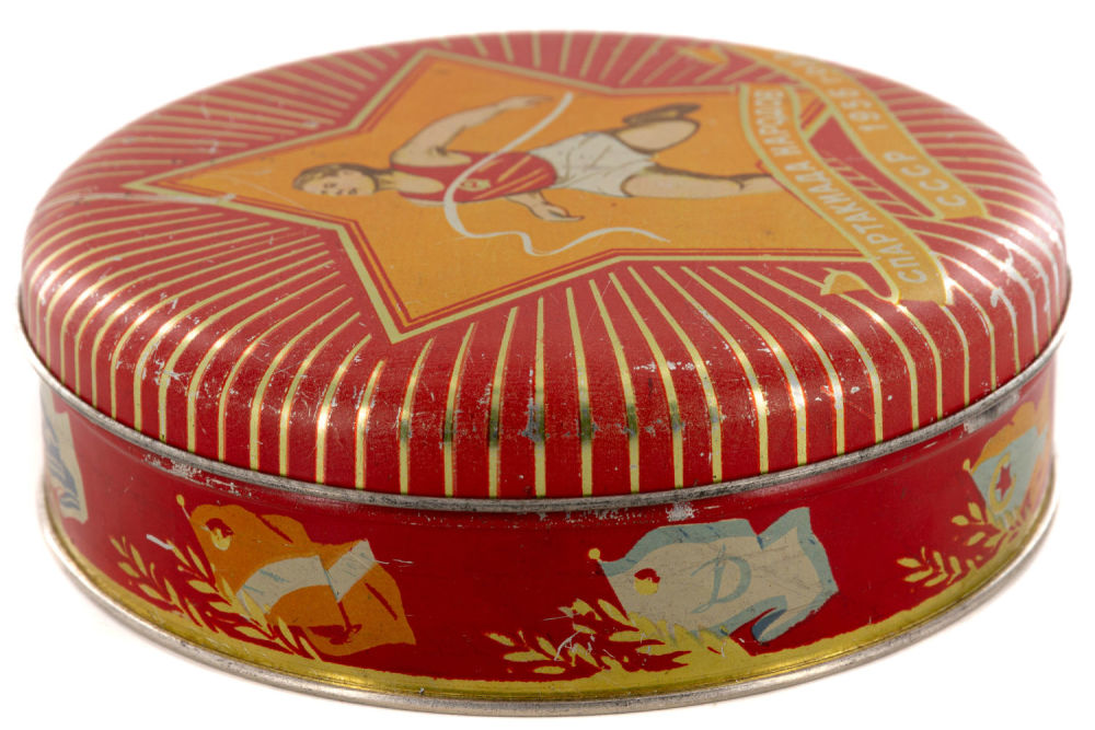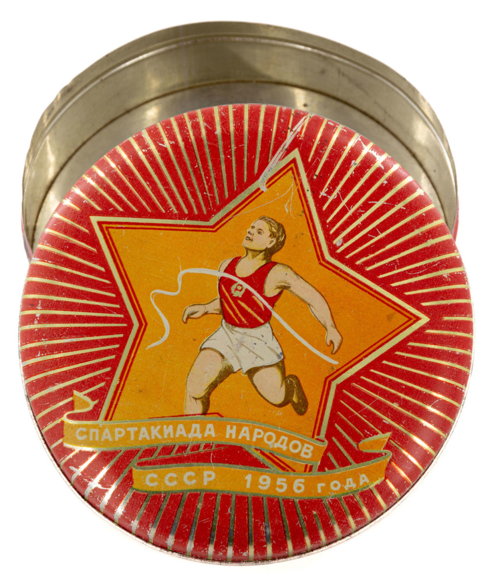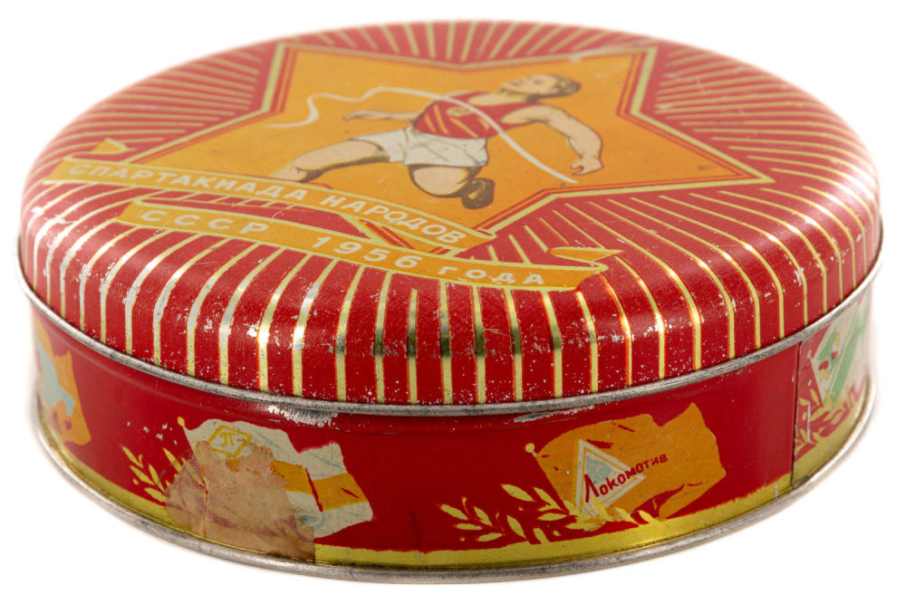 СССР. Жесть, печать, фабричное производство. На крышке надпись: «Спартакиада народов СССР 1956 года». Размеры: высота – 4,5 см; диаметр – 15,4 см. Состояние: в хорошей сохранности, незначительные царапины, следы бытования.