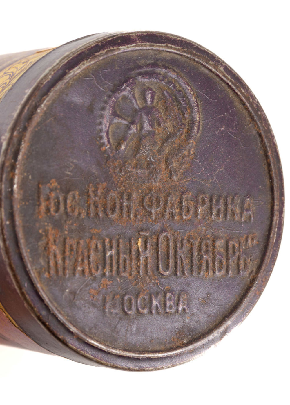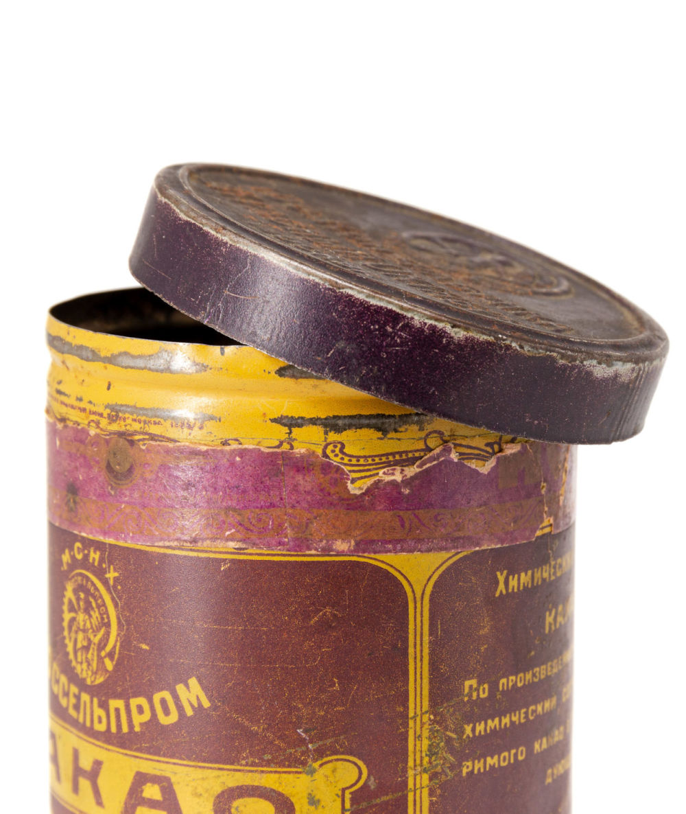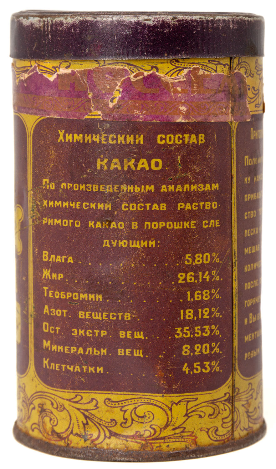 СССР, Москва, фабрика «Красный Октябрь». Жесть, рельеф, печать, фабричное производство. Надпись на крышке: «Гос. Кон. фабрика «Красный Октябрь» Москва». Надписи на банке: «М.С.Н.Х. Моссельпром Какао Золотой ярлык Госуд. кондит. фабрика «Красный Октябрь» Москва.», химический состав продукта и рецепт приготовления. Размеры: высота – 13,1 см; диаметр – 7,9 см. Состояние: в хорошей сохранности, следы ржачины, следы бытования.