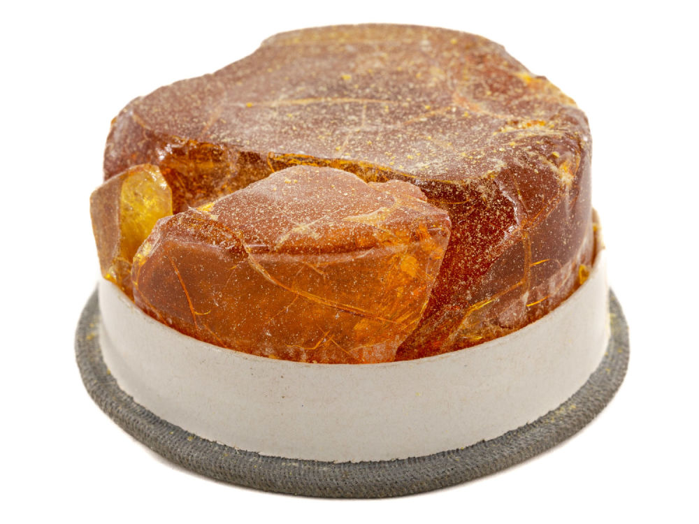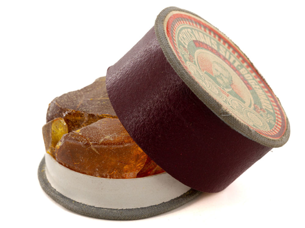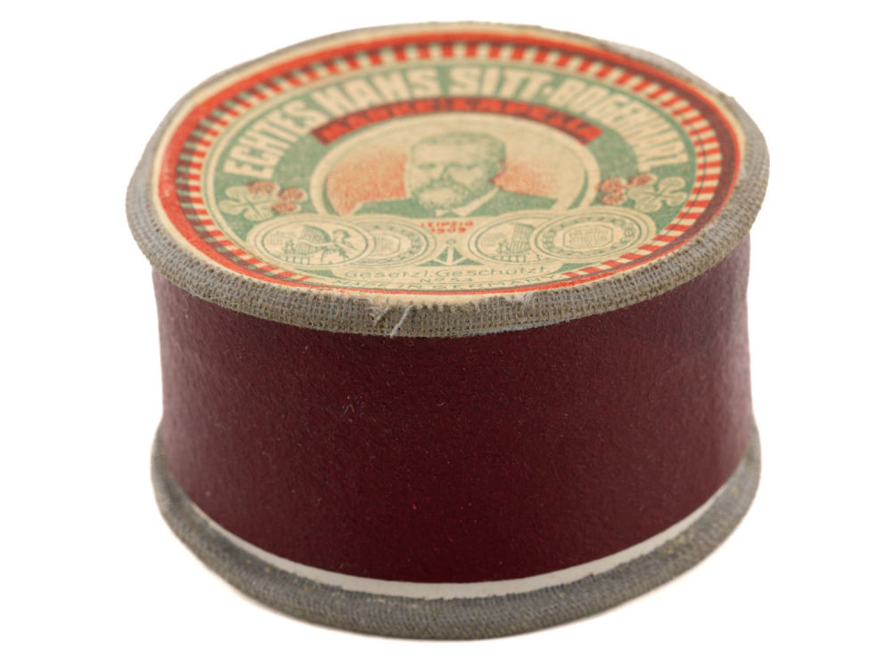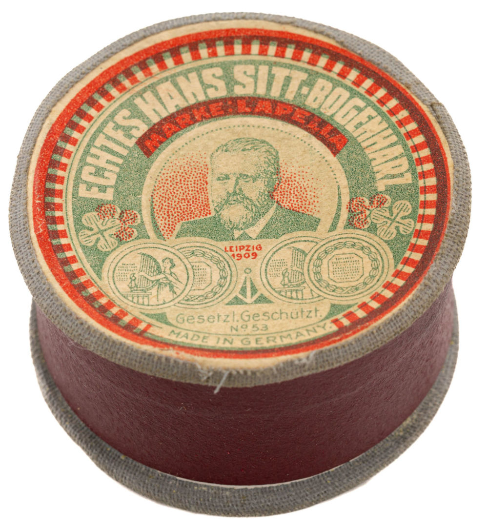 Германия, Лейпциг. Картон, ткань; бумага, печать; канифоль; фабричное производство. На крышке надписи: «Echtes hans sitt-bogenharz / Marke: Lapella», «Leipzig 1909», «Gesetzl.Geschützt. №53», «Made in Germany». Размеры: высота – 2,7 см; диаметр – 5 см. Состояние: в хорошей сохранности.