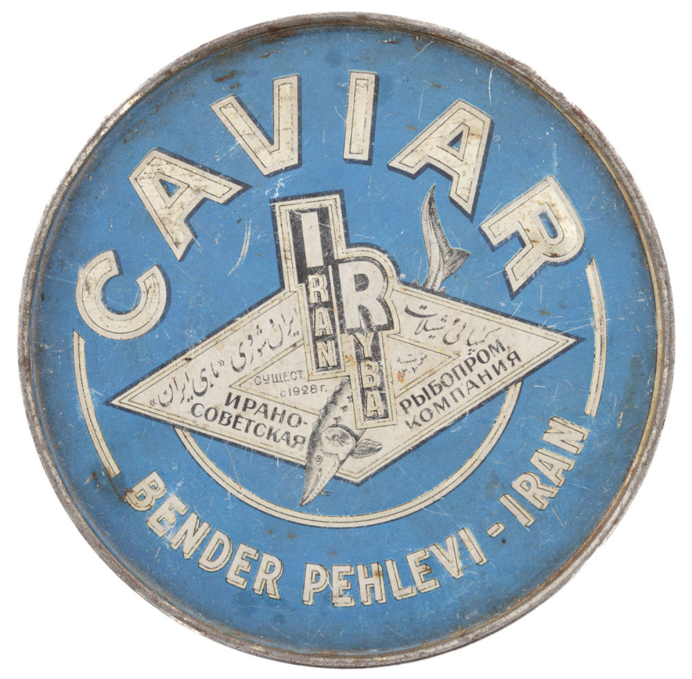СССР. Жесть, печать, фабричное производство. Надписи на крышке коробки: «Caviar Iran Ryba Ирано-советская рыбпром. компания сущест. с 1928 г.», «Bender Pehlevi–Iran». Размеры: высота – 8,4 см; диаметр – 16,2 см. Состояние: в хорошей сохранности, незначительные следы бытования, незначительные следы ржавчины, на боку следы от наклейки.