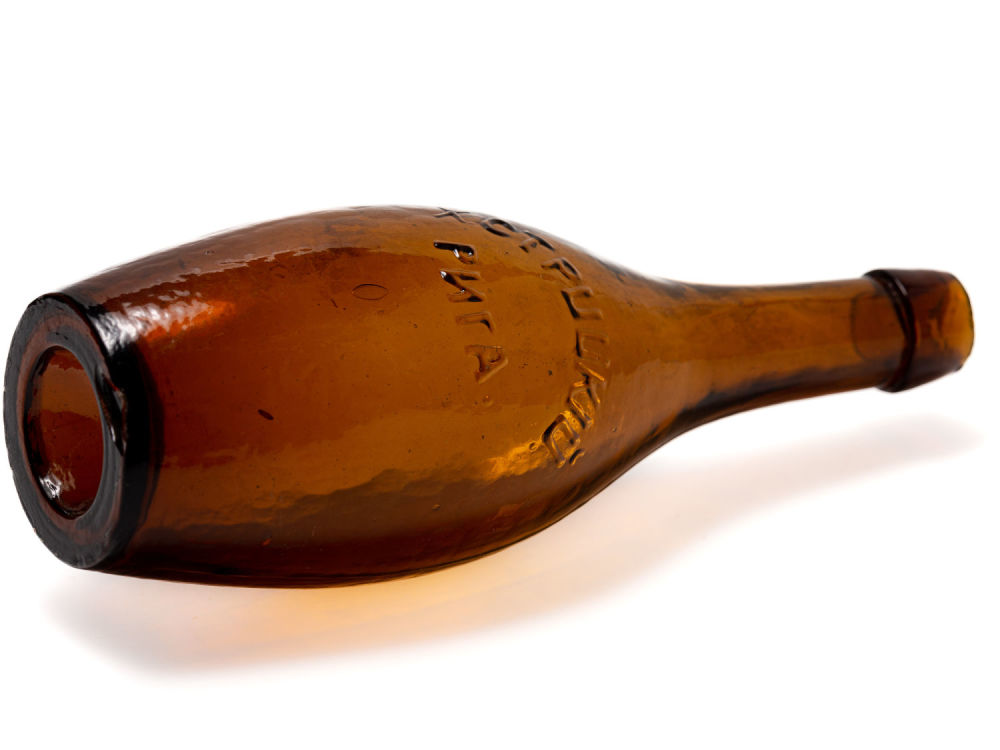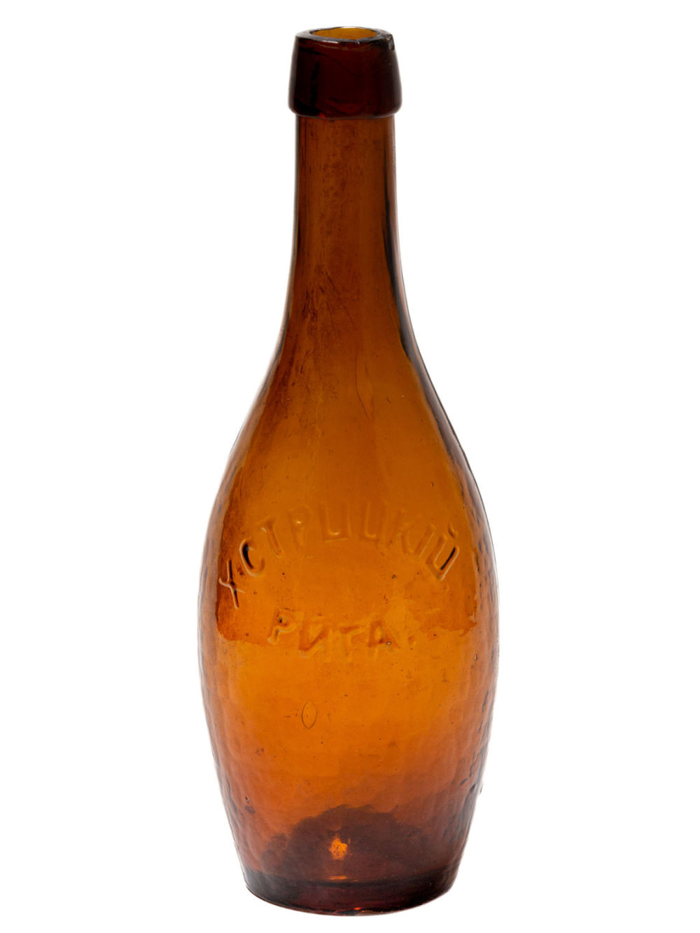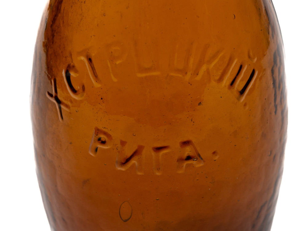 Российская империя, Рига. Цветное стекло, штамповка. Надпись на боку бутылки: «Х. Стрицкiй Рига.». Размеры: высота – 21,8 см. Состояние: в хорошей сохранности, незначительный скол на горле, сколы на основании, следы бытования.