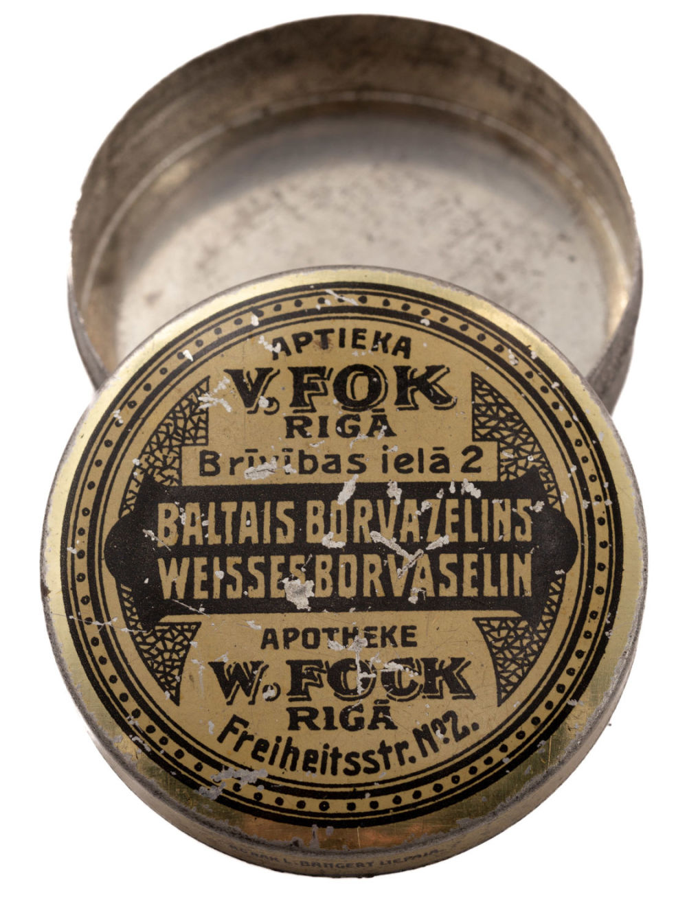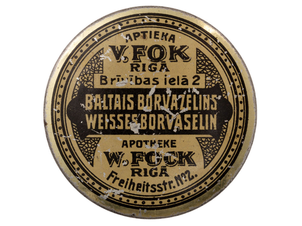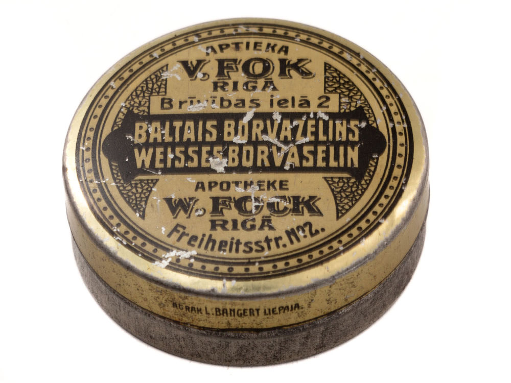 Латвия, Рига. Жесть, печать, фабричное производство. Надписи на крышке: «Aptieka V. Fok Riga Brivibas iela 2», «Baltais Borvazelins Weisses Borvaselin», «Apotheke W. Fock Riga Freiheitsstr. №2.», «Atrak L. Bangert Liepaja». Размеры: высота – 1,5 см; диаметр – 5 см. Состояние: в хорошей сохранности, незначительные утраты красочного слоя.