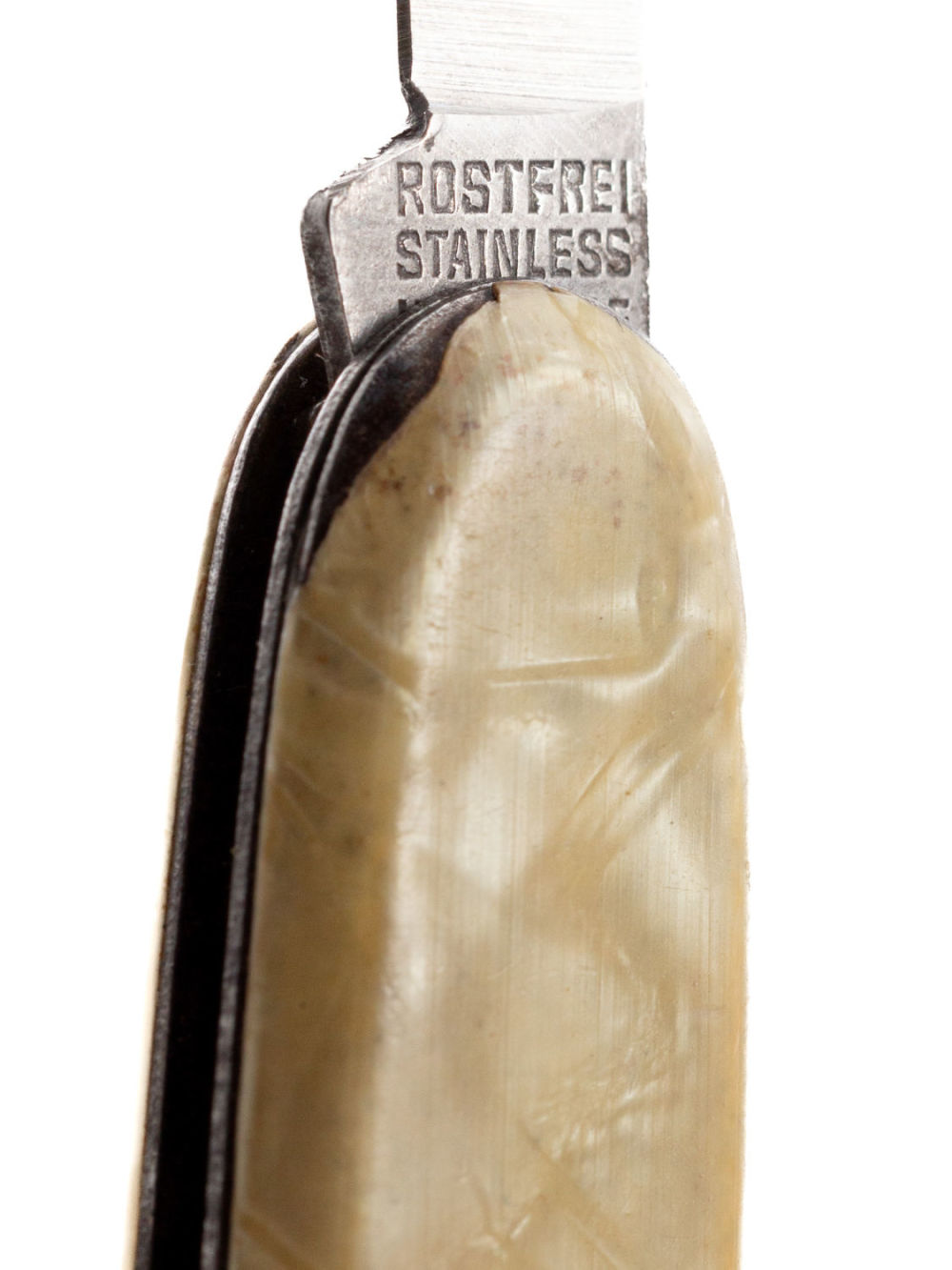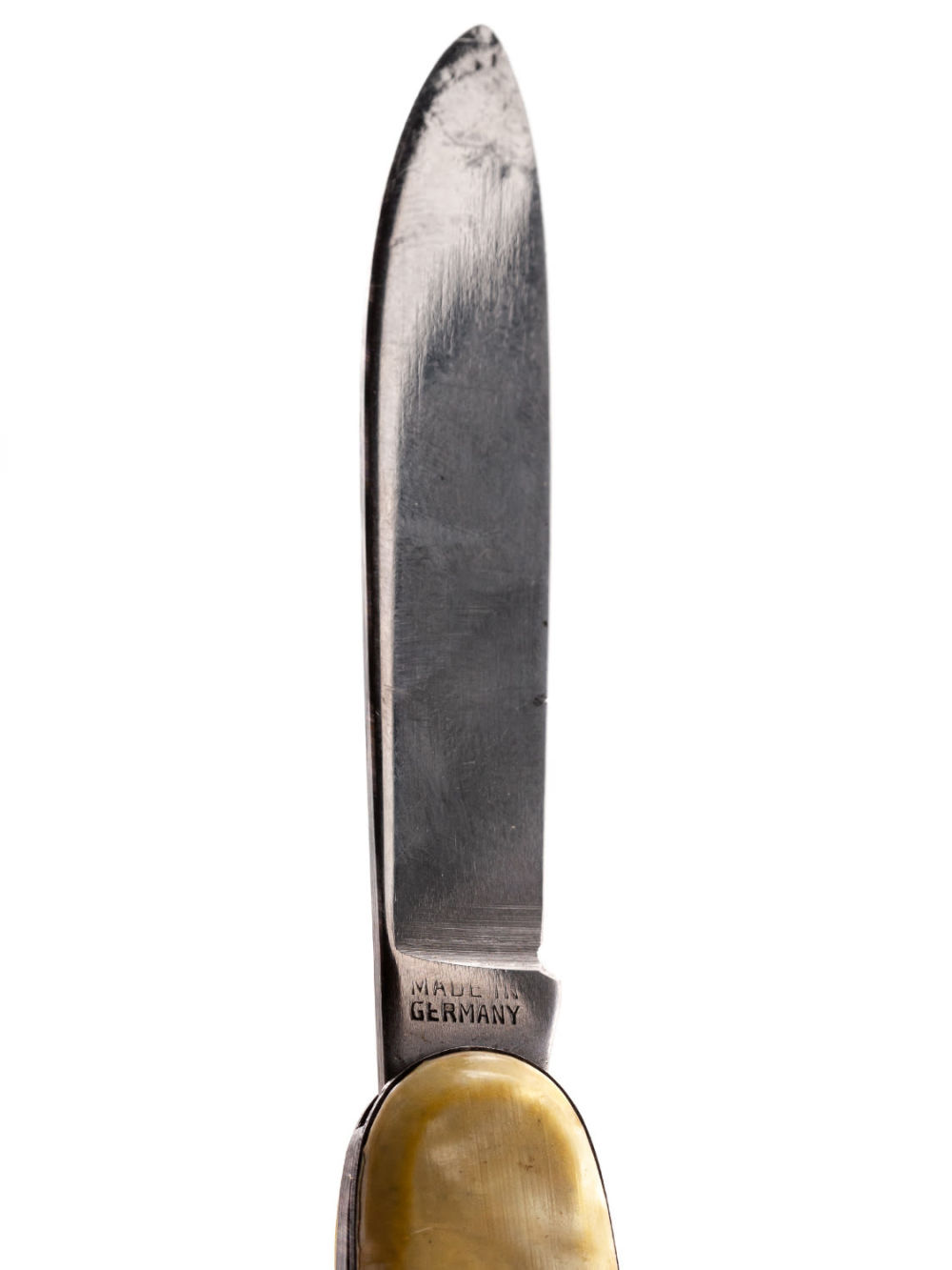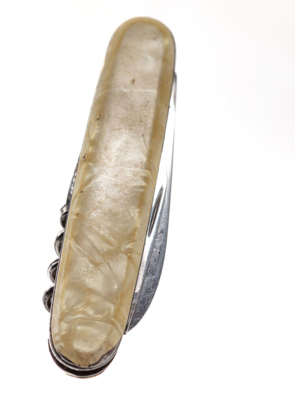 Европа, Германия. Сплав металлов, штамповка; пластик, имитирующий перламутр. У ножа два лезвия и штопор. На лезвиях надписи: «Made in Germany», «Rostfrei Stainless Inoxydable» (нержавеющая сталь). Размеры: длина в разложенном виде – 19,7 см, в сложенном – 9,1 см. Состояние: в хорошей сохранности, незначительные следы ржавчины, следы бытования.