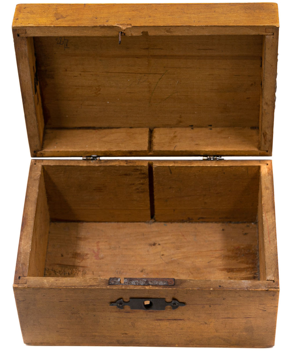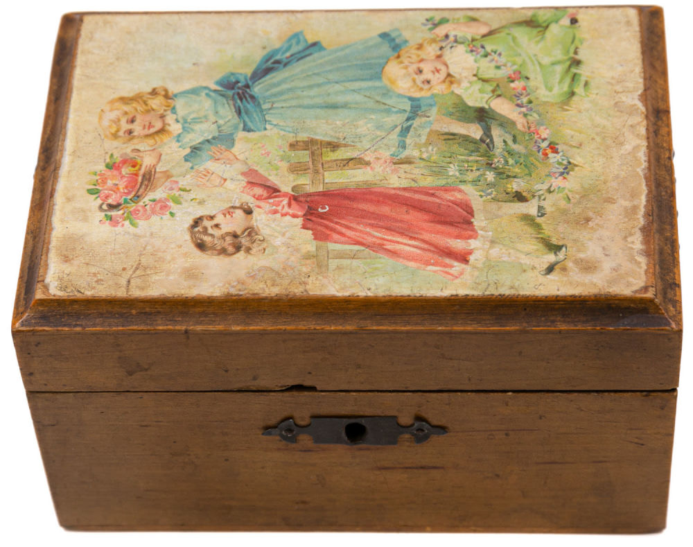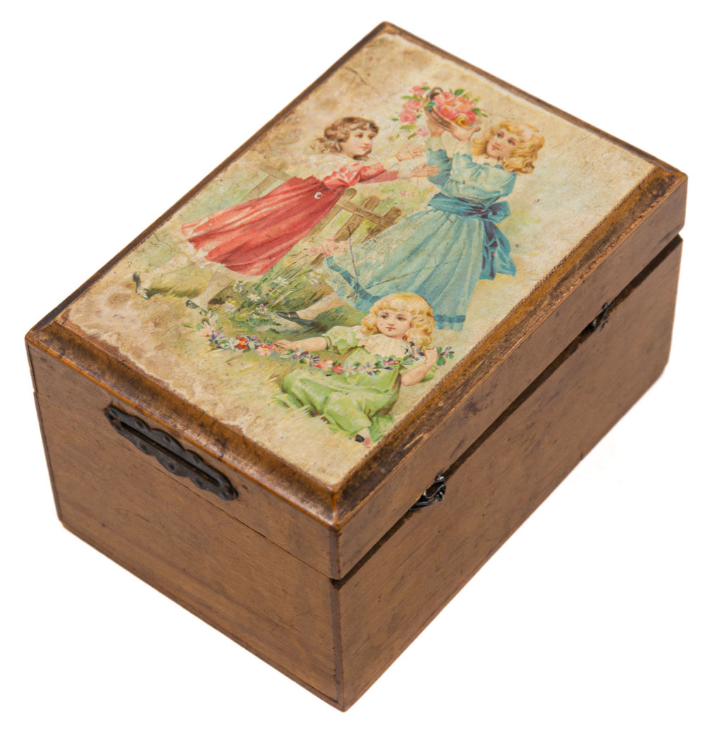 Европа. Дерево, сплав металлов, декупаж. Состояние: в хорошей сохранности, следы бытования, загрязнения на донышке, владельческая реставрация петлей, ключ утрачен, на внутренней стороне крышки надпись карандашом: «28/V». Размеры: 9х16,5 см.