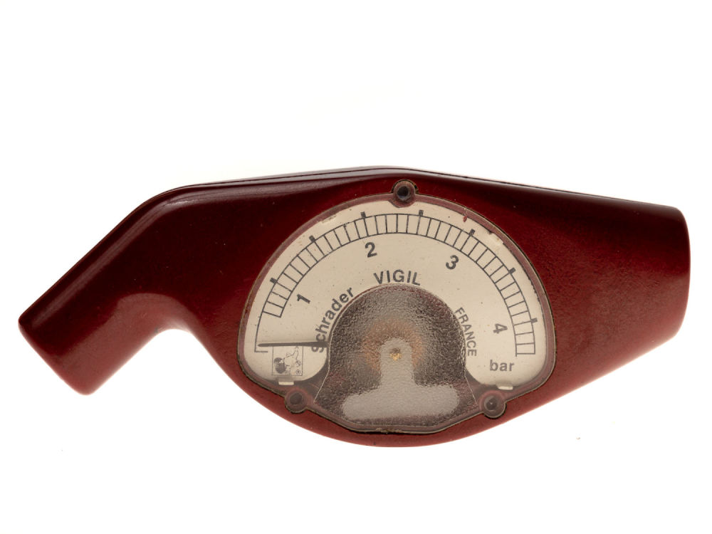 Франция. Бакелит, сплав металлов, фабричное производство. Надпись на циферблате: «Schrader Vigil France». На оборотной стороне надпись «Michelin» и логотип компании Michelin. Размеры: 8,6х3,5 см. Состояние: в хорошей сохранности. Прибор в рабочем состоянии.