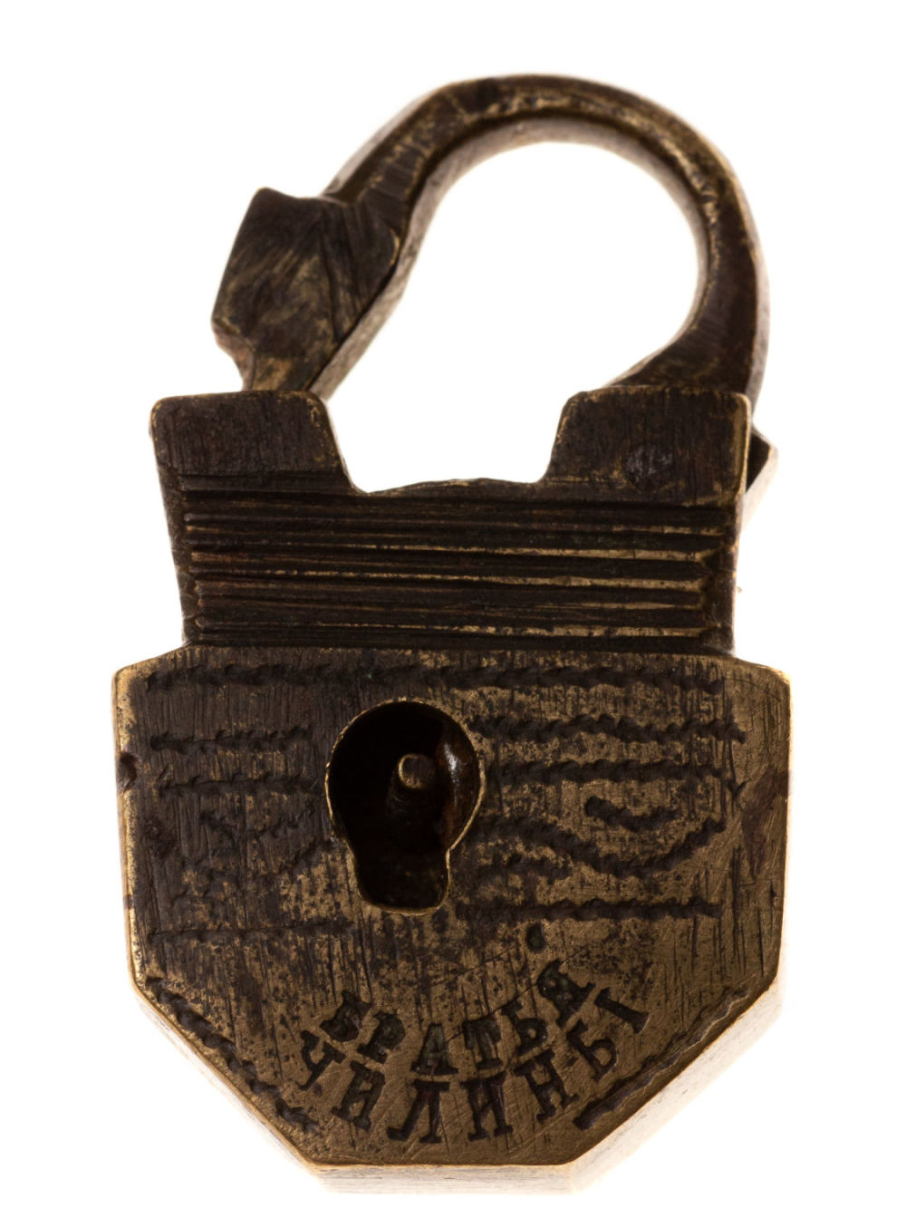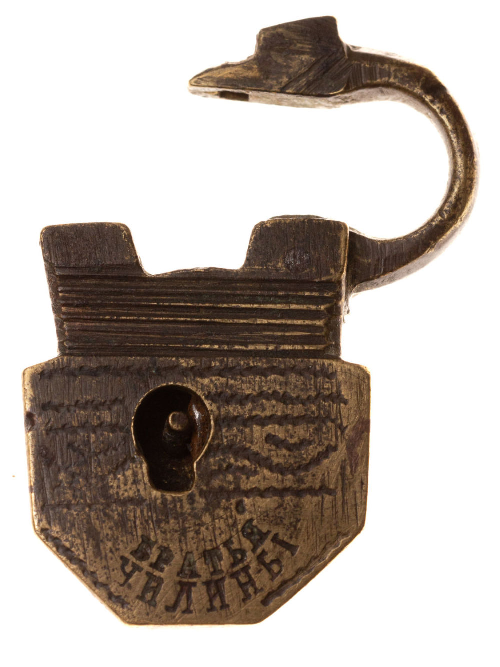 Российская империя, с. Павлово. Клеймо «Братья Чилины». Сплав металлов, штамповка, гравировка. Размеры: высота – 3,4 см; ширина – 2 см. Состояние: в хорошей сохранности, ключ утрачен.