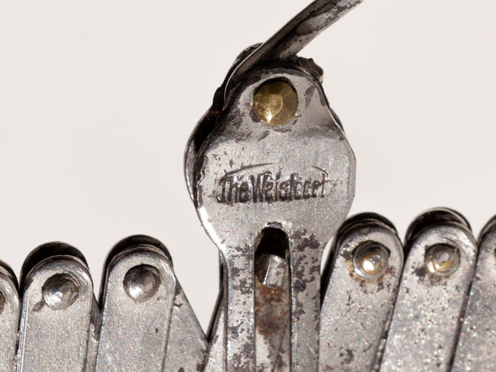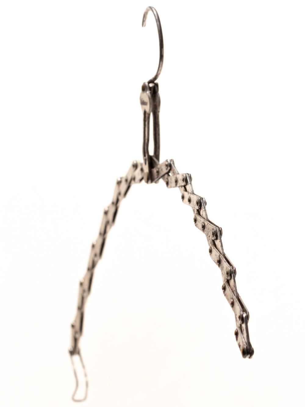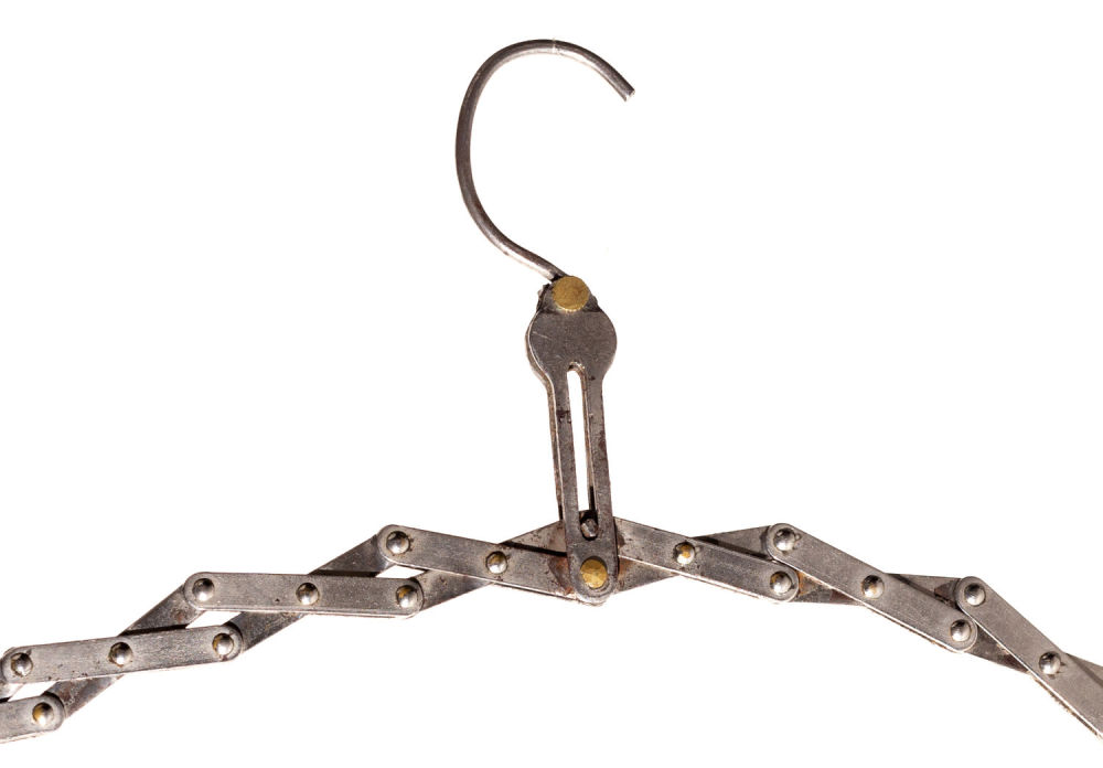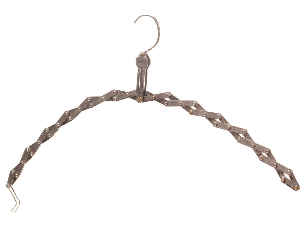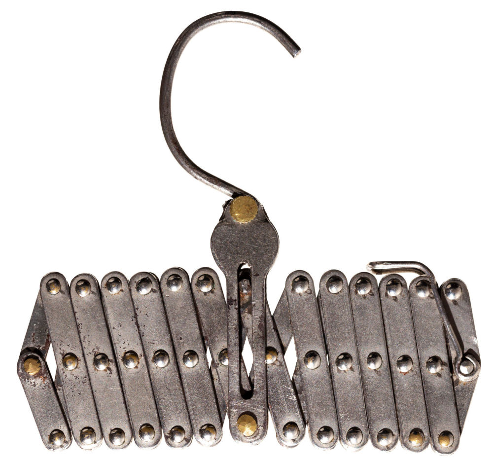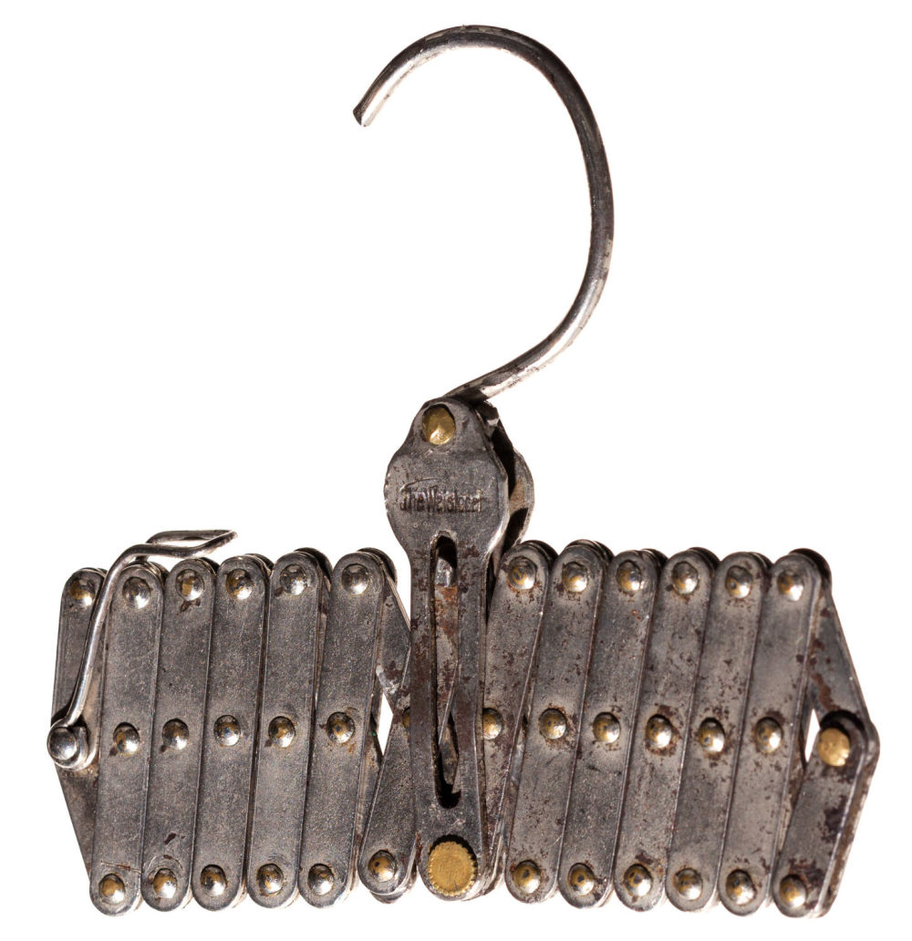 Англия. На креплении для ручки вешалки – клеймо. Сплав металлов, фабричное производство. Размеры: высота – 9,3 см; длина (в разложенном состоянии) – 45 см; длина (в сложенном состоянии) – 10,5 см.
