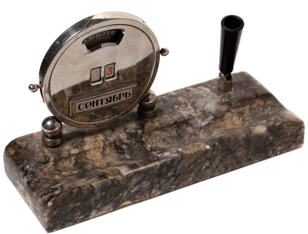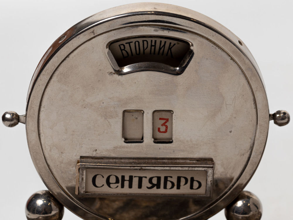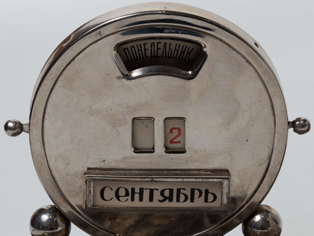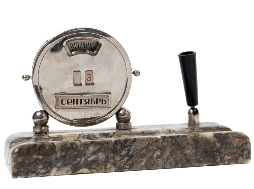 Календарь в рабочем состоянии – при помощи рычажчков по бокам переставляются цифры даты, при помощи поворотного механизма сзади переставляются дни недели.