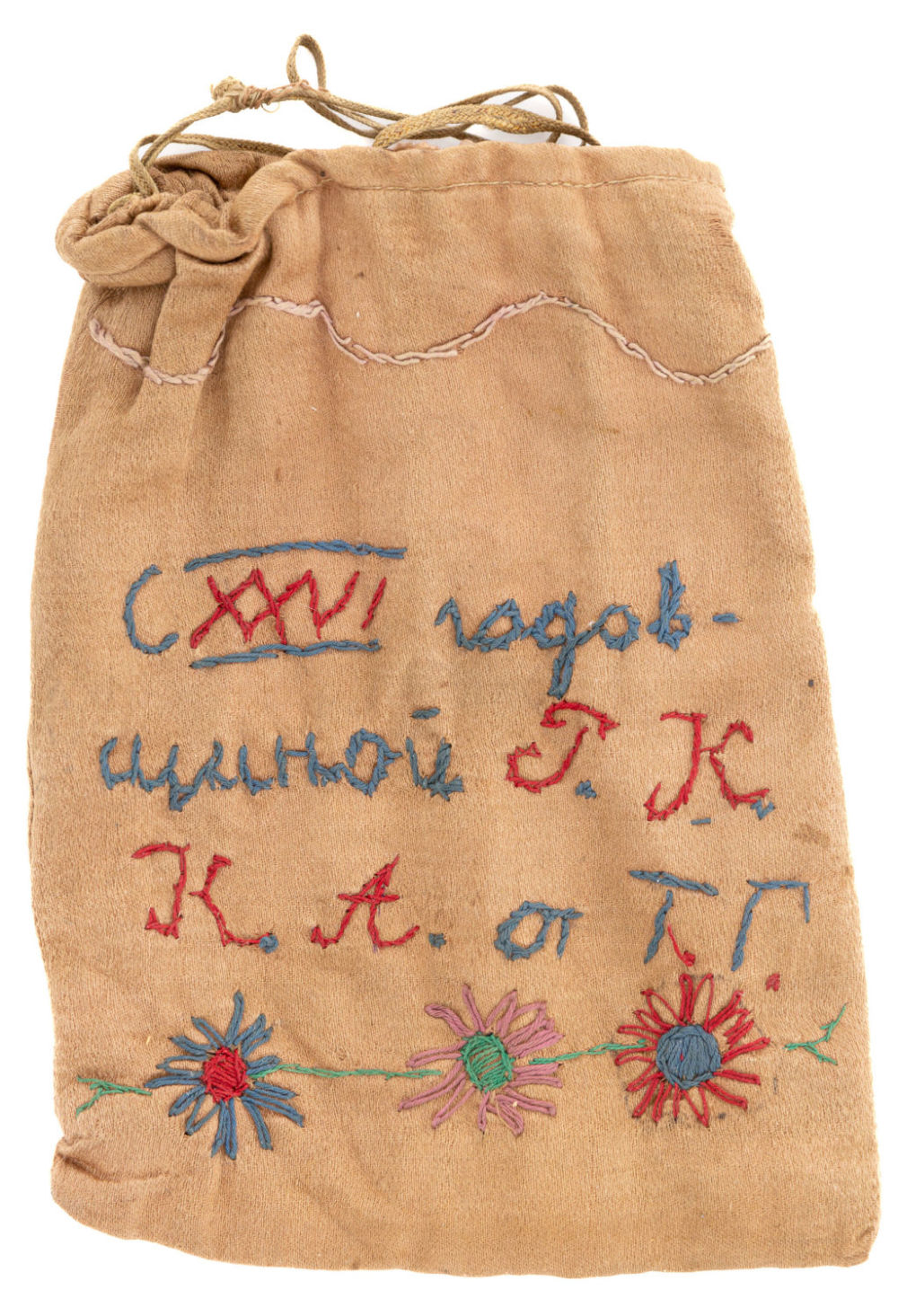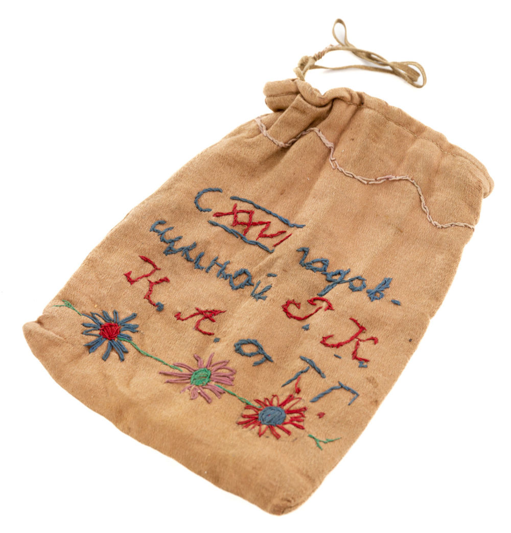 СССР. Ткань, вышивка; табак. На кисете вышита надпись: «С XXVI годовщиной Р.К.К.А. от Т.Г.». Размеры: высота – 17 см, ширина – 12,7 см. Состояние: в хорошей сохранности, незначительные следы бытования, остатки табака.